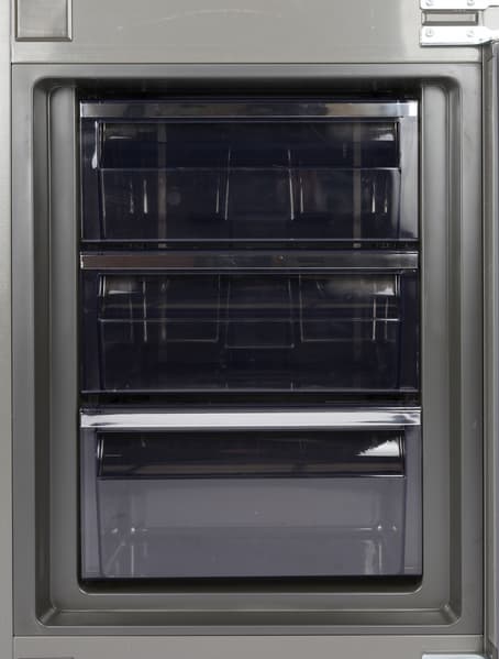 В морозильном отделении три пластиковых ящика. Два верхних одинакового размера, а третий, за которым на задней стенке располагается отсек компрессора — чуть поменьше.