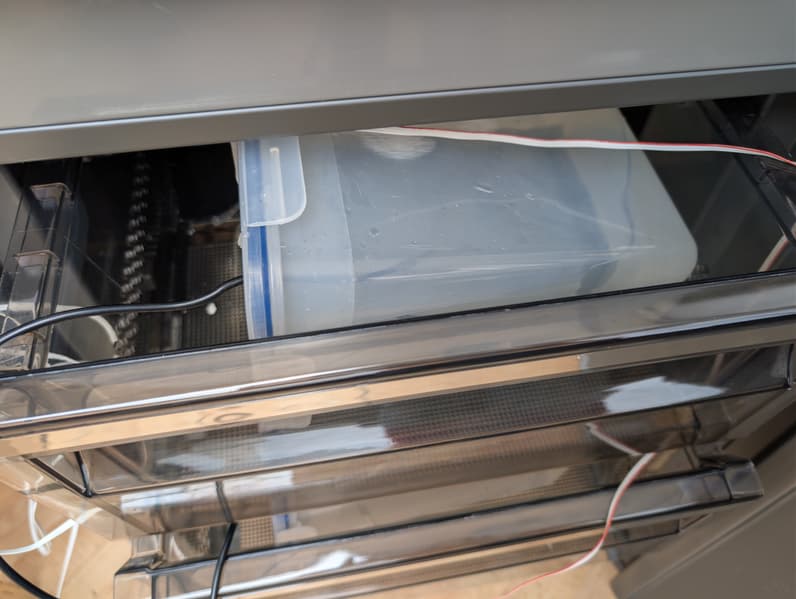 Помимо датчиков температуры воды использовались три датчика температуры воздуха. Их мы поместили во все три ящика — так, чтобы поверхность сенсоров не контактировала напрямую с элементами корпуса морозильной камеры и стенками контейнеров.