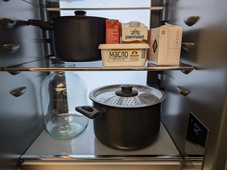 На нижней полке, которая служит одновременно крышкой ящика для овощей и фруктов, удобно хранить большую посуду — сюда без труда помещается четырех-пятилитровая кастрюля или трехлитровая стеклянная банка.