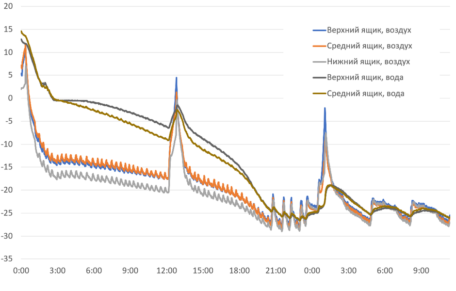 Вода в контейнерах охладилась до нуля приблизительно через 4 часа после начала теста, а признаки замерзания появились через 5-6 часов. Через 12 часов после начала эксперимента алгоритм работы компрессора заметно изменился: после небольшой паузы он продолжил охлаждение, а на отметке в 21 час сделал еще один перерыв.
