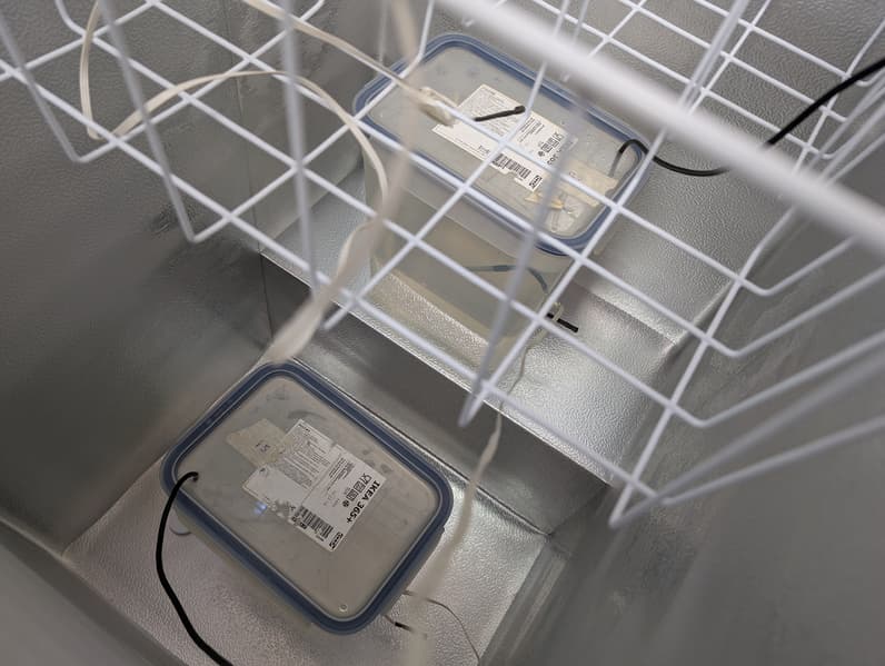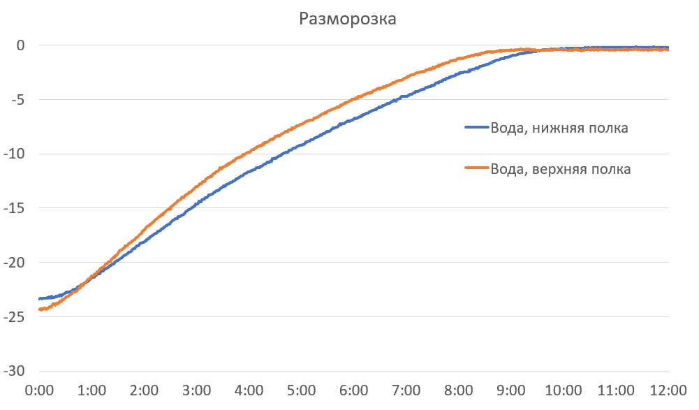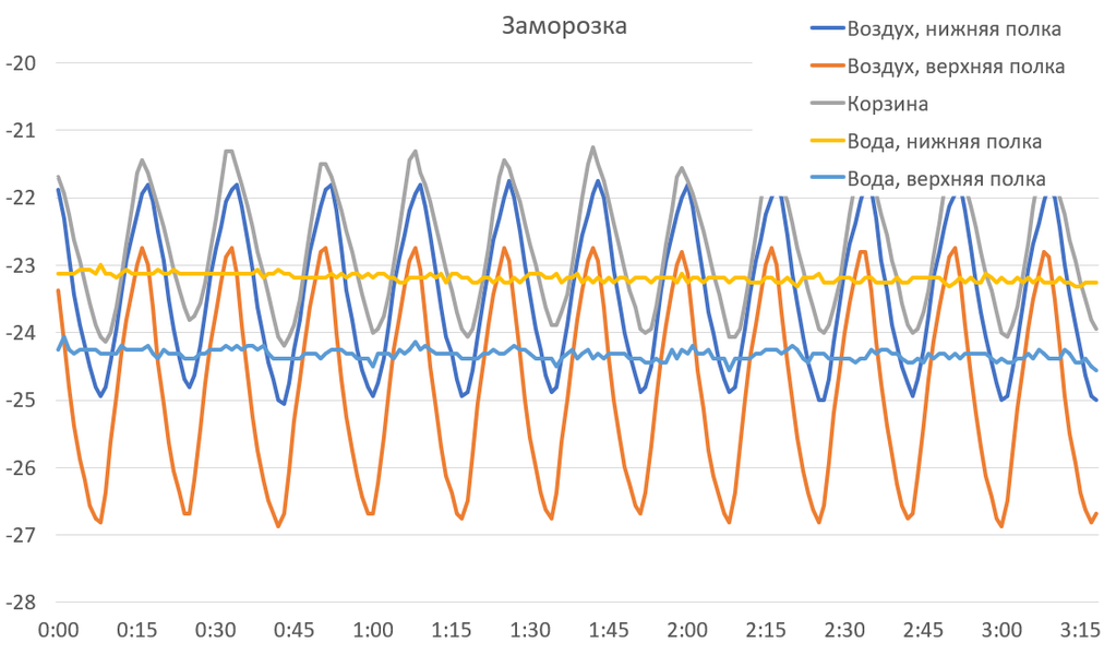В контейнере, стоящем на полу основного отделения, температура опустилась ниже нуля приблизительно через 19 часов со старта теста. Кристаллизация в контейнере, который стоял над холодильным агрегатом, началась значительно быстрее: минусовую отметку температура содержимого в нем пересекла через 3 часа с начала эксперимента. Примерно через 30 часов температура воздуха и льда стабилизировалась на значениях 22-28 градусов ниже нуля.