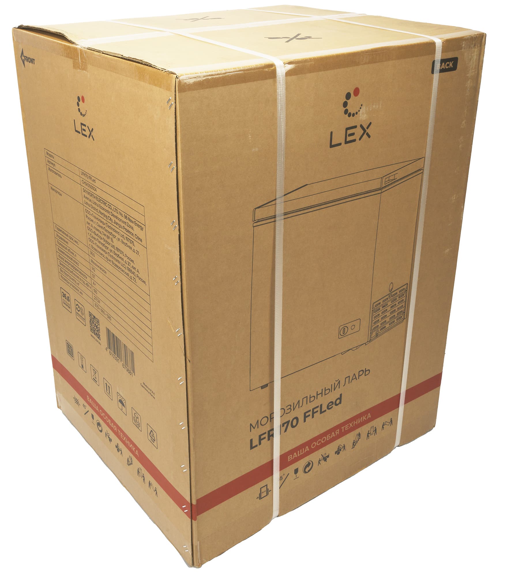 Морозильный ларь Lex LFR170 FFLed поставляется в картонном коробе, который установлен на пенопластовое основание и притянут к нему капроновыми стропами.