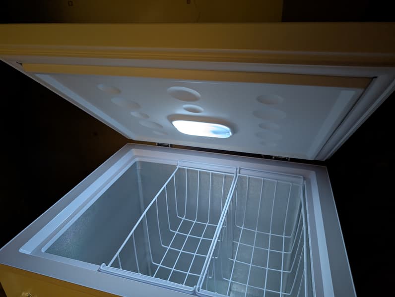 На внутренней стороне мы видим плафон светодиодной подсветки: элемент, не слишком часто встречающийся в морозильных ларях. Несмотря на явный прогресс в разработке светодиодов с низким тепловыделением, большинство производителей, вероятно, до сих пор избегают размещать световое оборудование в замораживаемой зоне, и наша модель оказалась приятным исключением из этого правила.