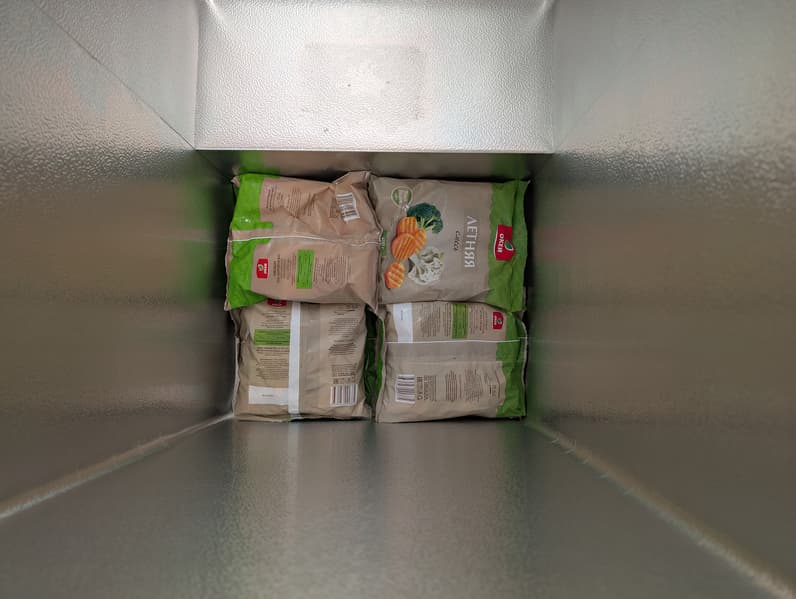 На полу основного объема камеры свободно размещаются четыре пакета. Уступ, образованный морозильным агрегатом, вмещает еще пару стопок.