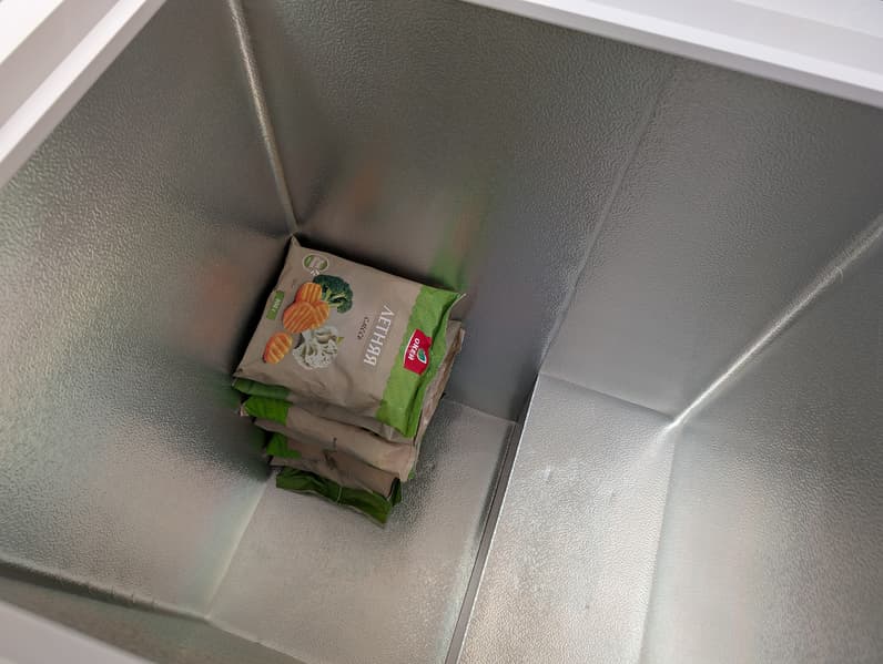 Помимо традиционных, с помощью рулетки, измерений внутреннего объема морозильной камеры мы также демонстрируем ее вместимость на наглядных примерах, используя стандартные (400 г) пакеты с замороженными овощами.