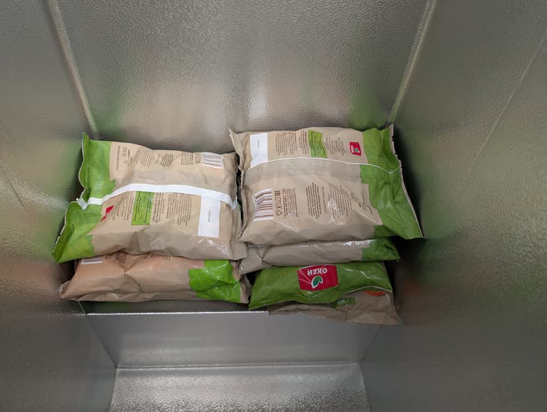 Стопка из восьми 400-граммовых пакетов не доходит и до половины высоты: при таком размещении можно положить внутрь восемнадцать-девятнадцать упаковок.