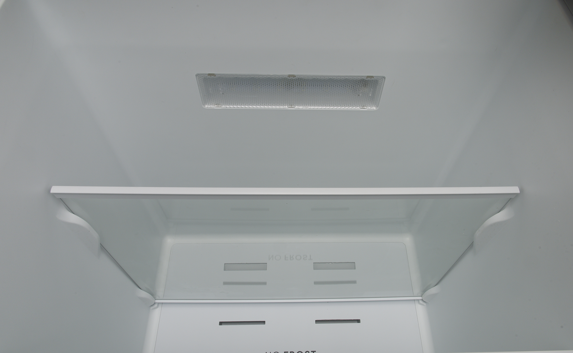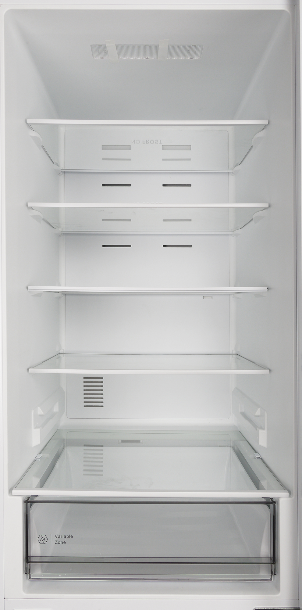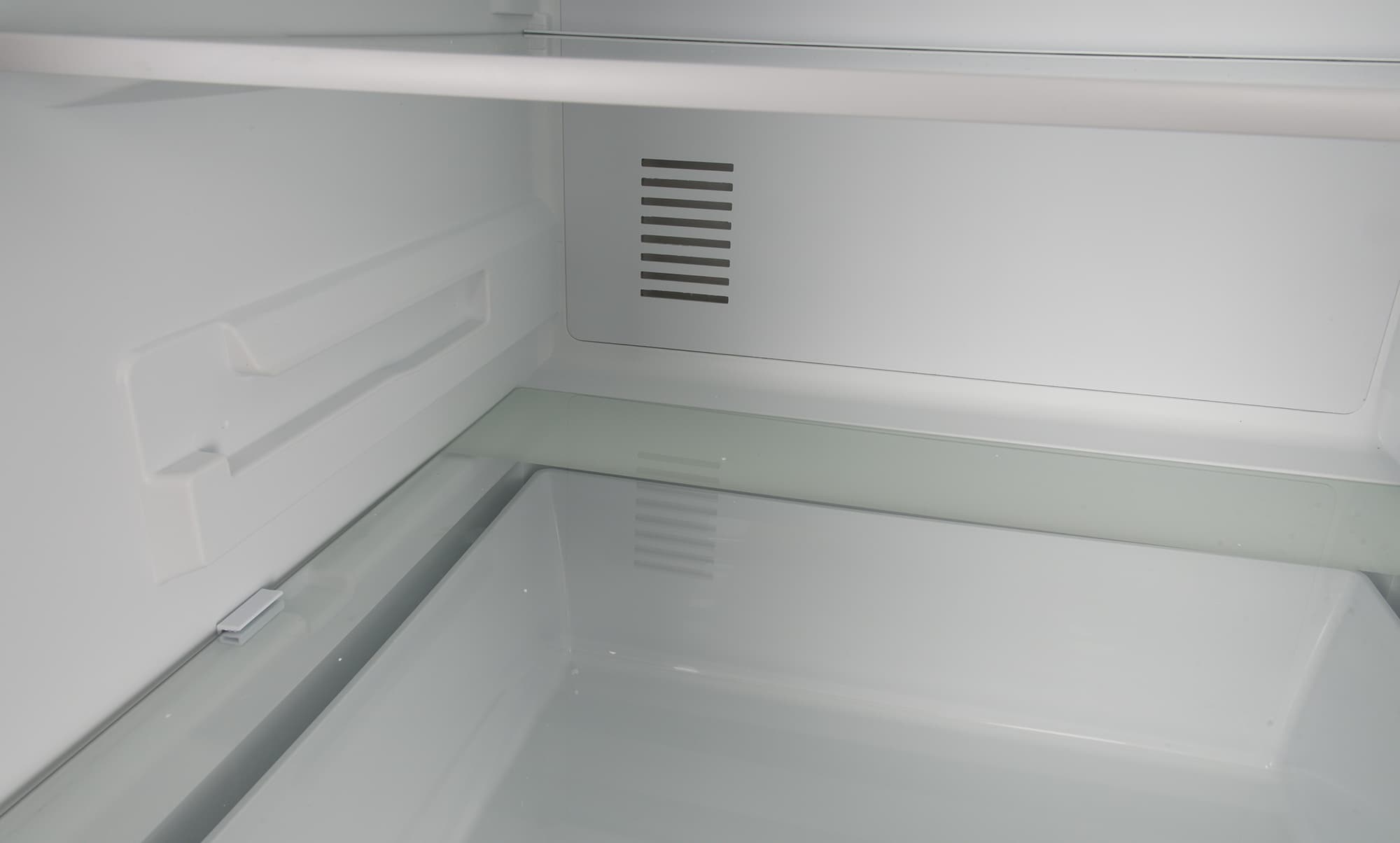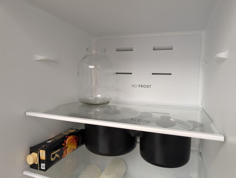 Холодильное отделение оборудовано системой NoFrost: в нижней части задней стенки хорошо видны две вентиляционные решетки. Одна из них служит для циркуляции воздуха в основном объеме, вторая , размещенная за ящиком для овощей и фруктов, управляет микроклиматом в зоне свежести.