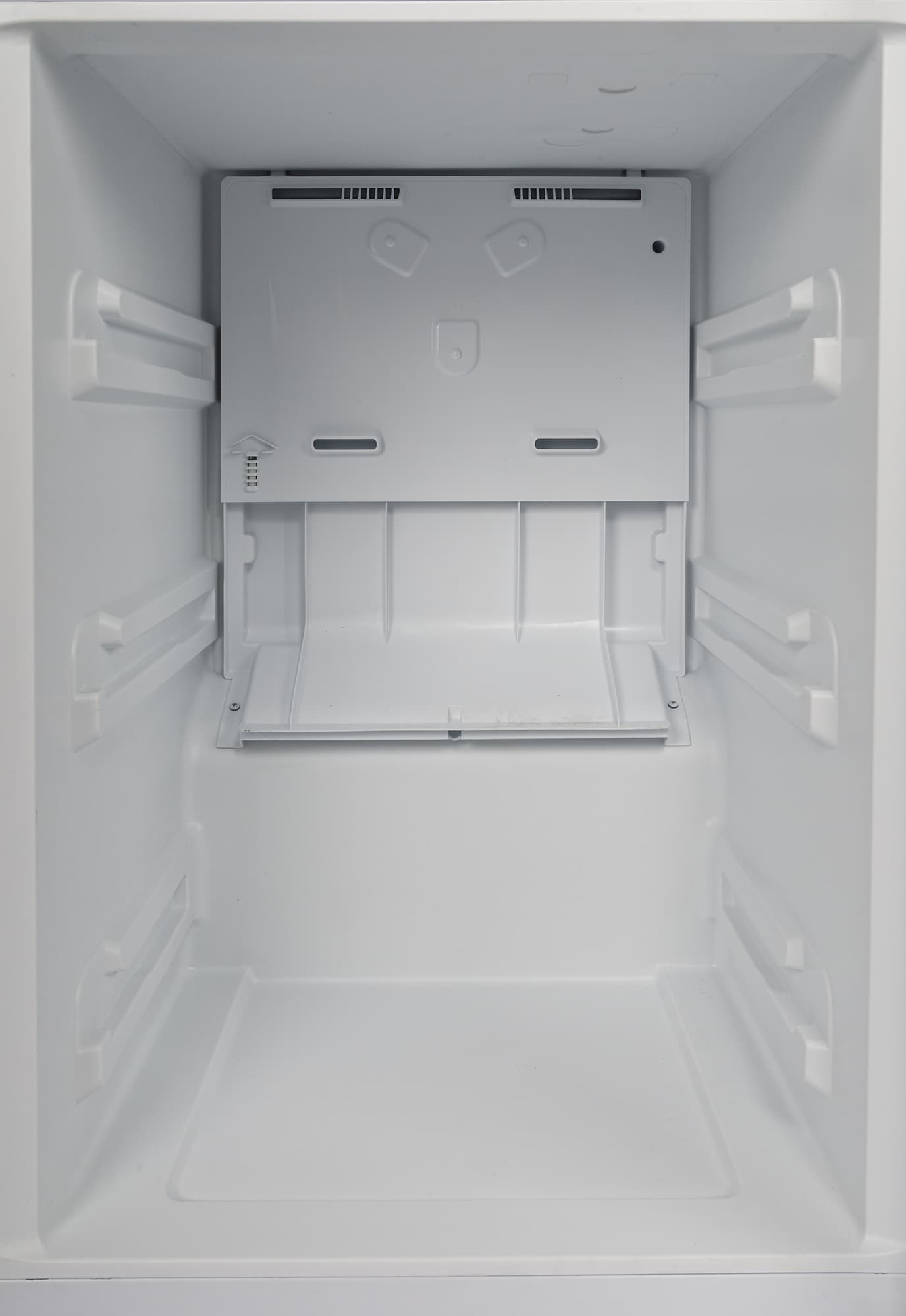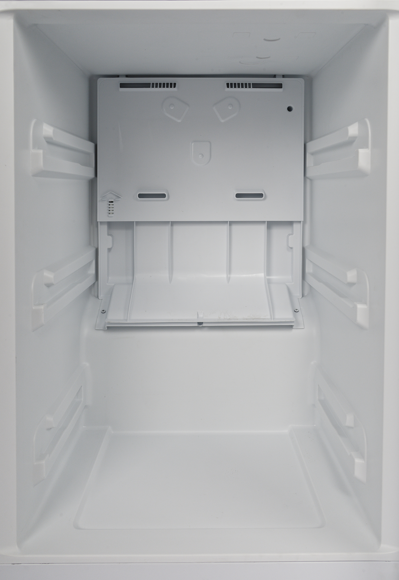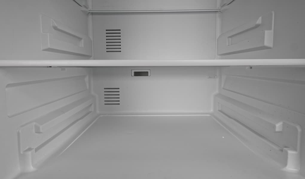 Холодильное отделение оборудовано системой NoFrost: в нижней части задней стенки хорошо видны две вентиляционные решетки. Одна из них служит для циркуляции воздуха в основном объеме, вторая , размещенная за ящиком для овощей и фруктов, управляет микроклиматом в зоне свежести.