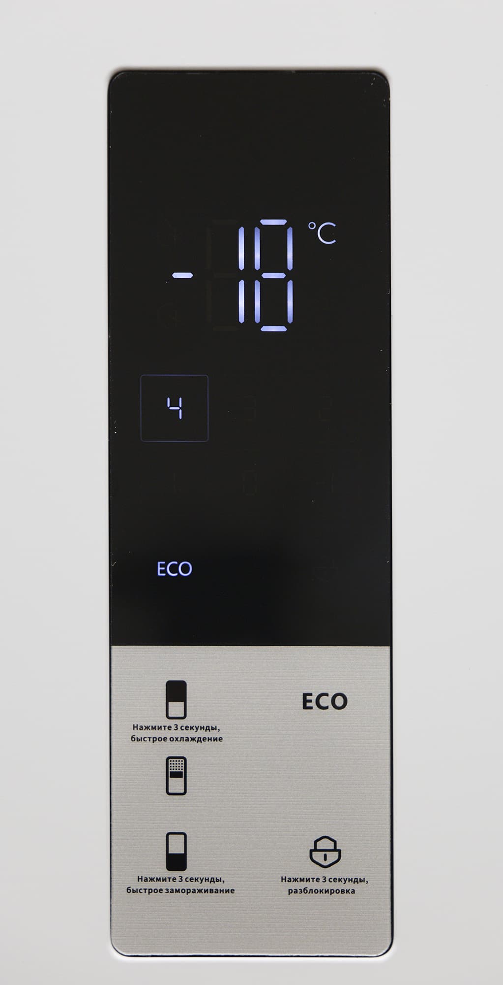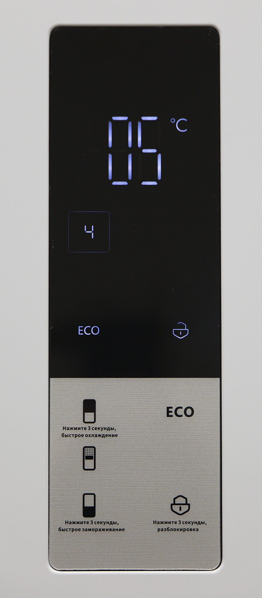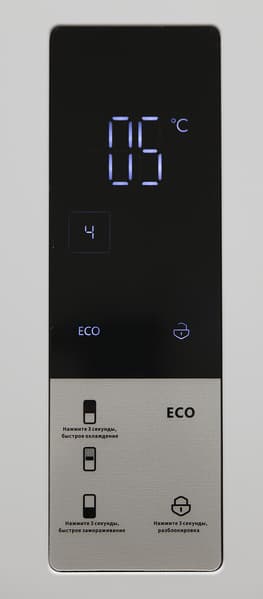 Длинное (3 секунды) нажатие на сенсоры холодильного и морозильного отделения включают, соответственно, режим суперохлаждения и суперзаморозки.