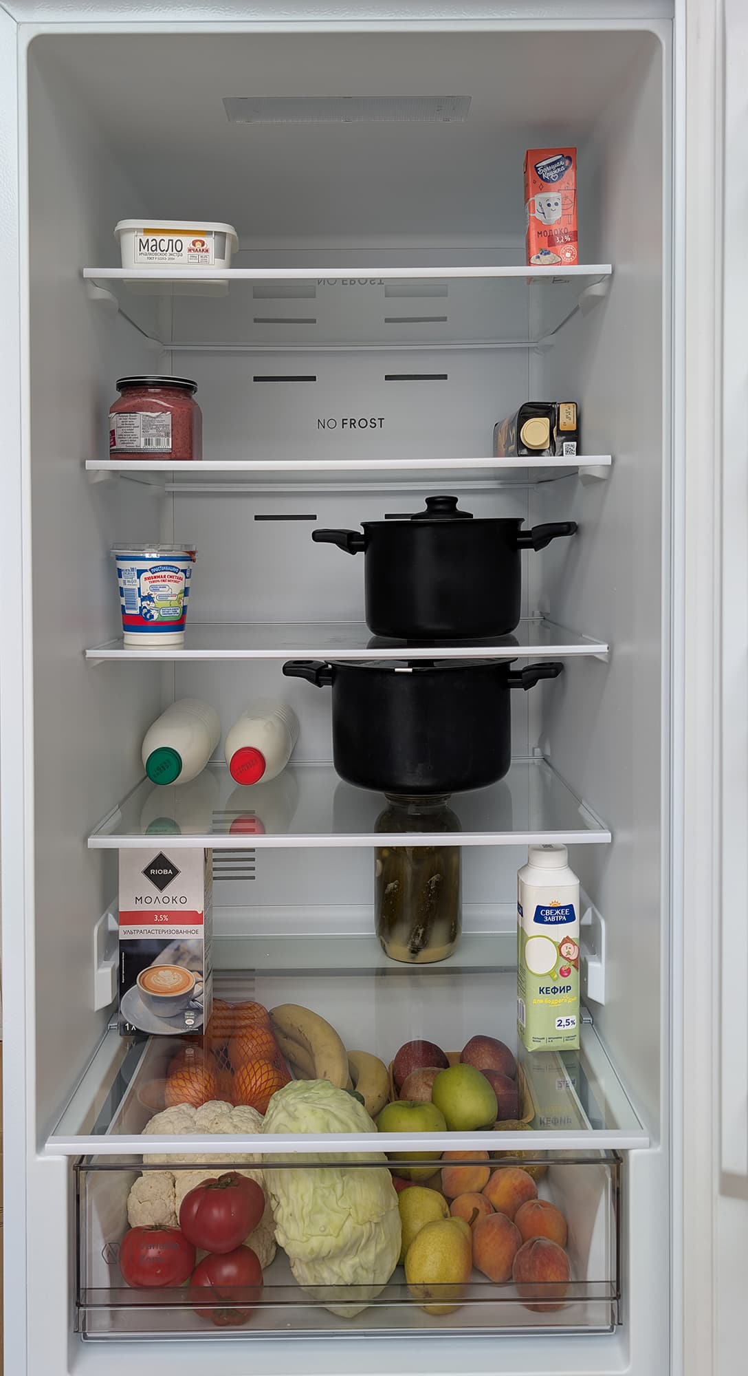 Расстояние между четырьмя верхними полками у этой модели, как мы помним, одинаковое: пространства достаточно, чтобы поставить пятилитровую кастрюлю с крышкой.
