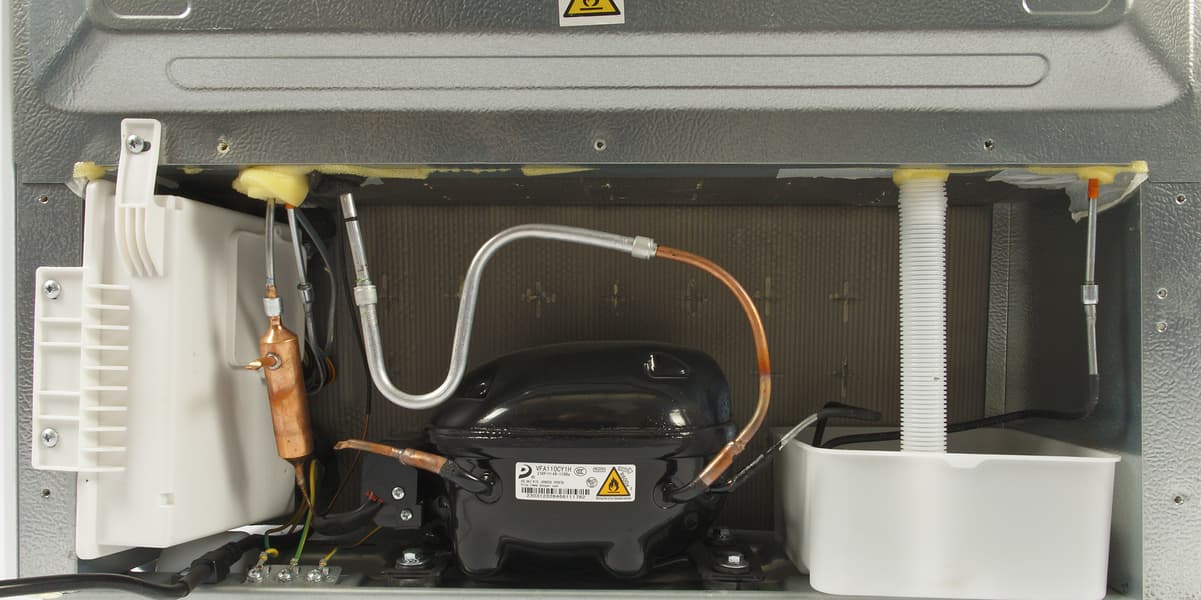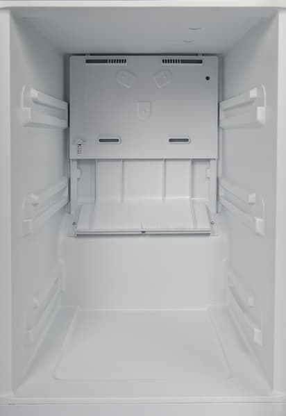Задняя стенка сделана из неокрашенного алюминия. В ее нижней части мы видим компрессорный отсек, закрытый пластиковым кожухом с вентиляционными отверстиями.