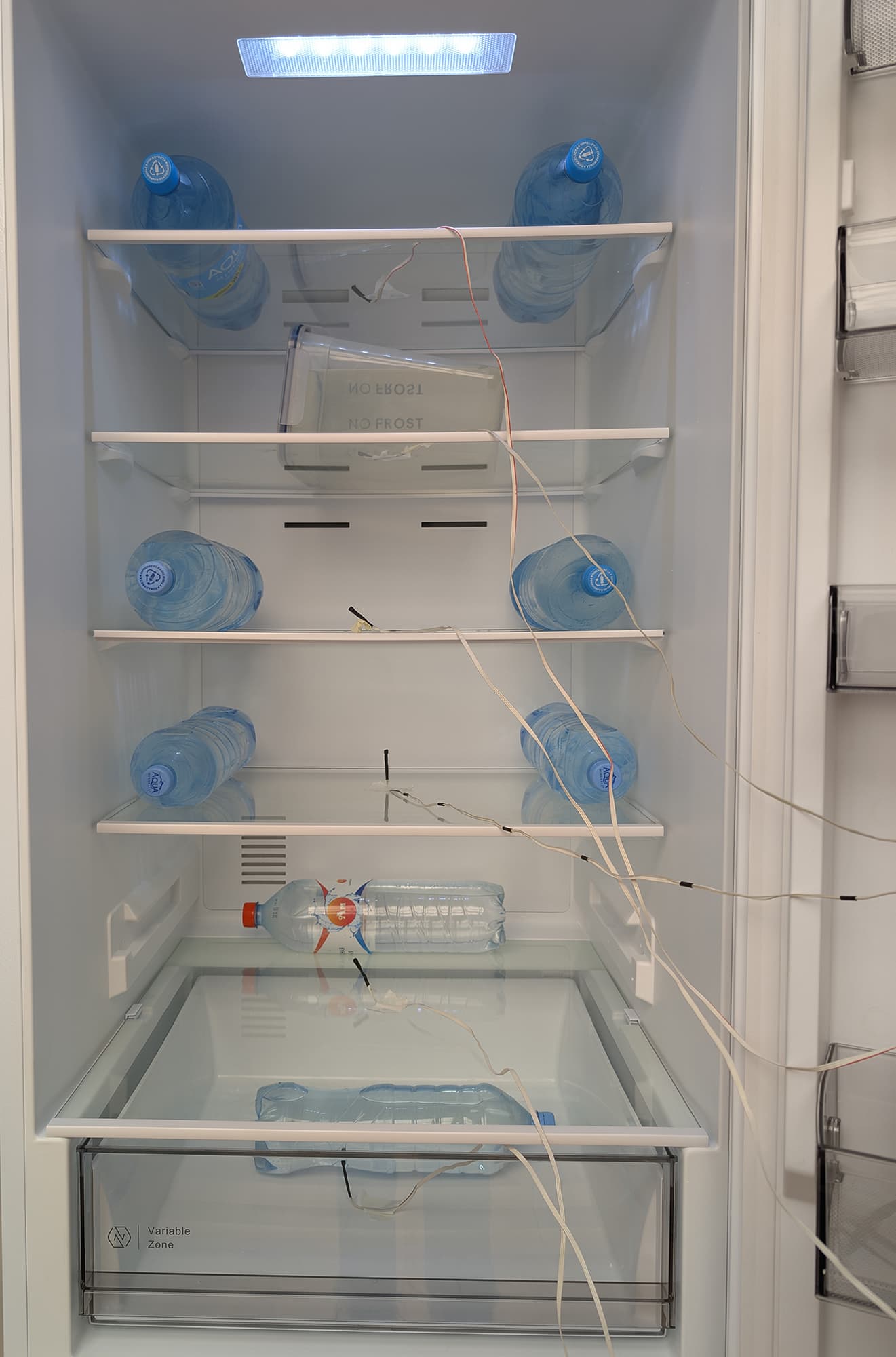 Чтобы имитировать работу загруженного холодильника, в процессе тестирования холодильной камеры мы использовали водяной балласт в таких же четырехлитровых контейнерах, как и при испытании морозилки. Кроме того, на полки и дверцу холодильника положили несколько пластиковых бутылок с водой.