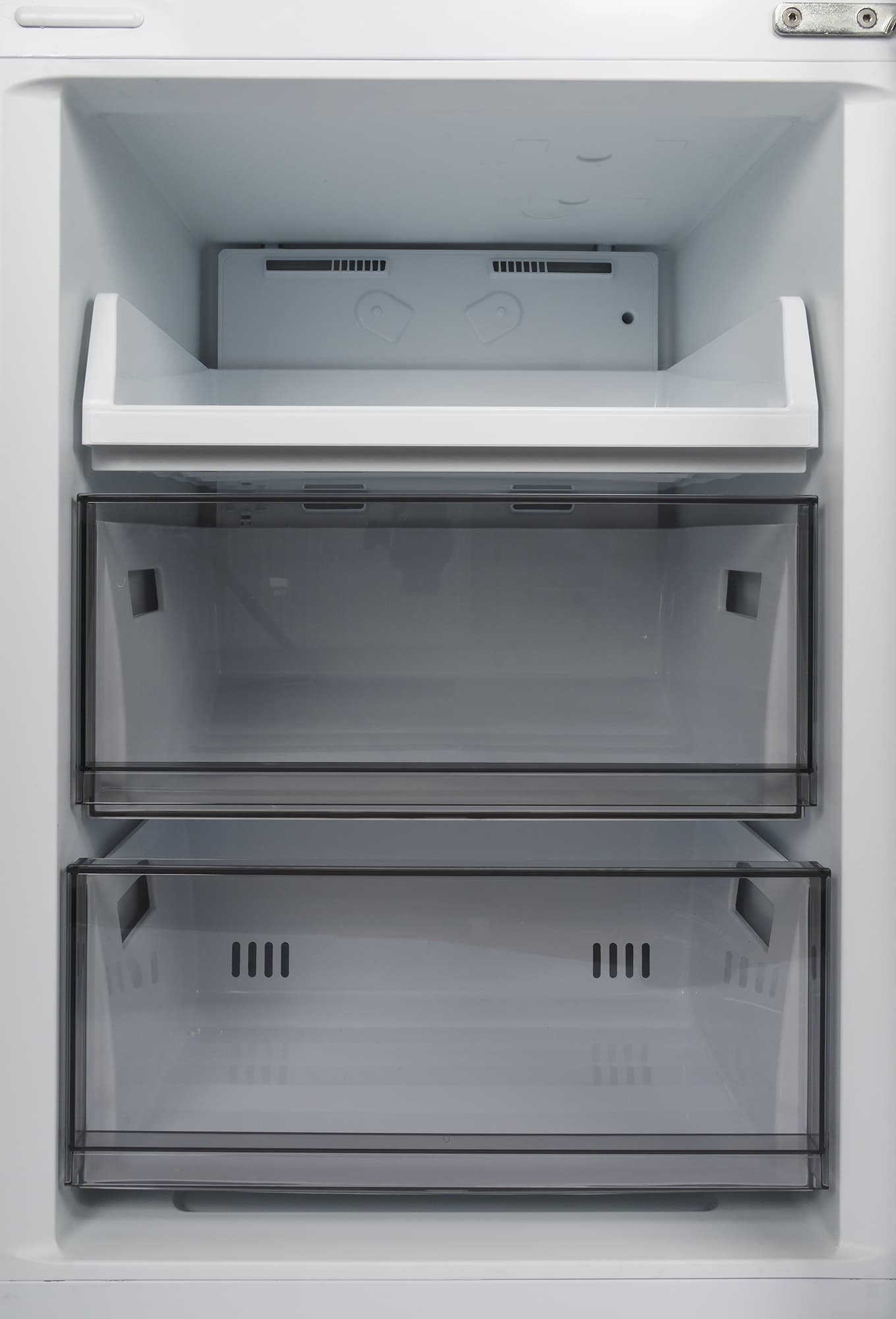 Ящики опираются на пластиковые направляющие в стенках камеры. Глубина нижнего чуть меньше, чем у среднего: за ним расположен отсек холодильного агрегата.