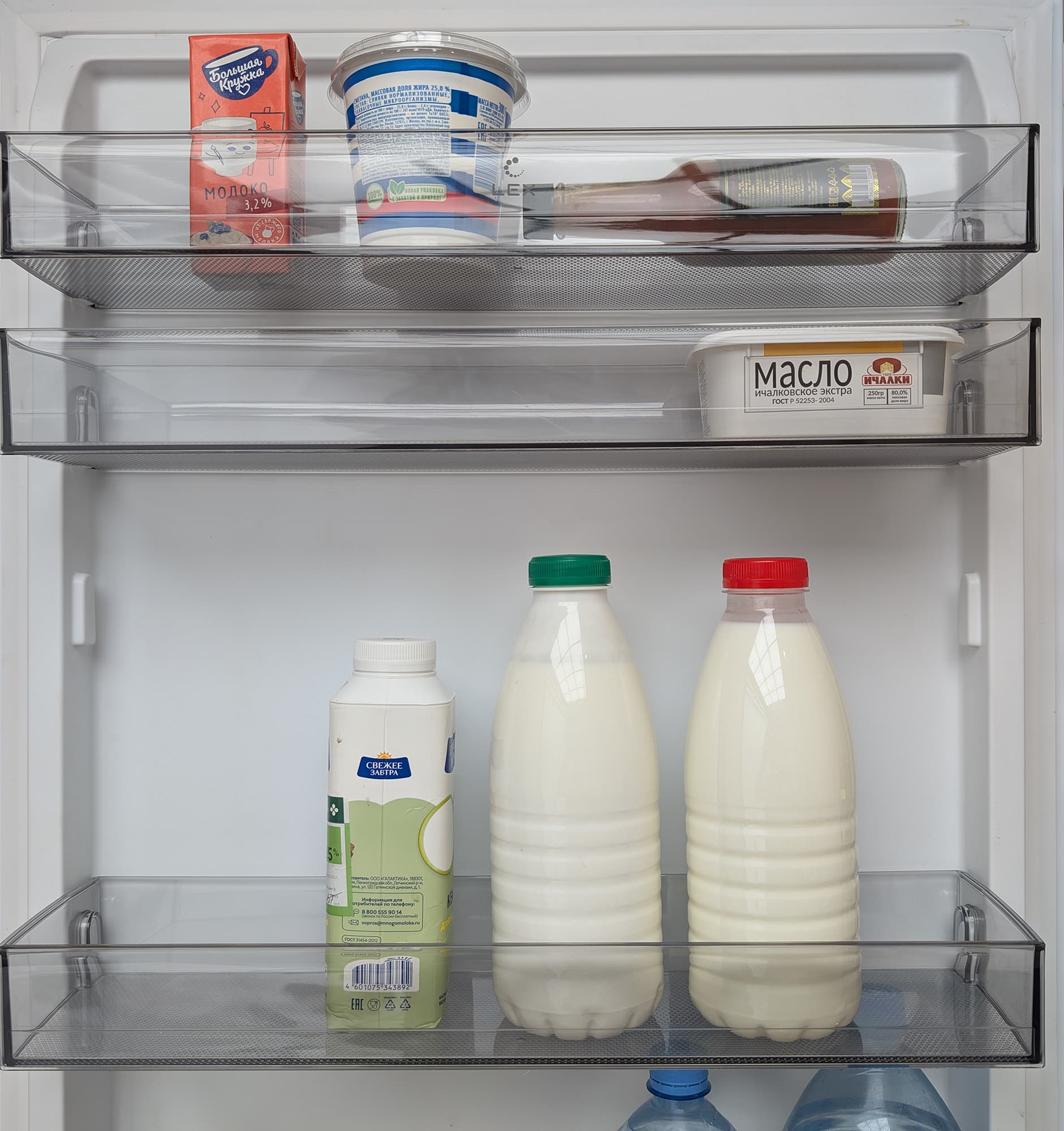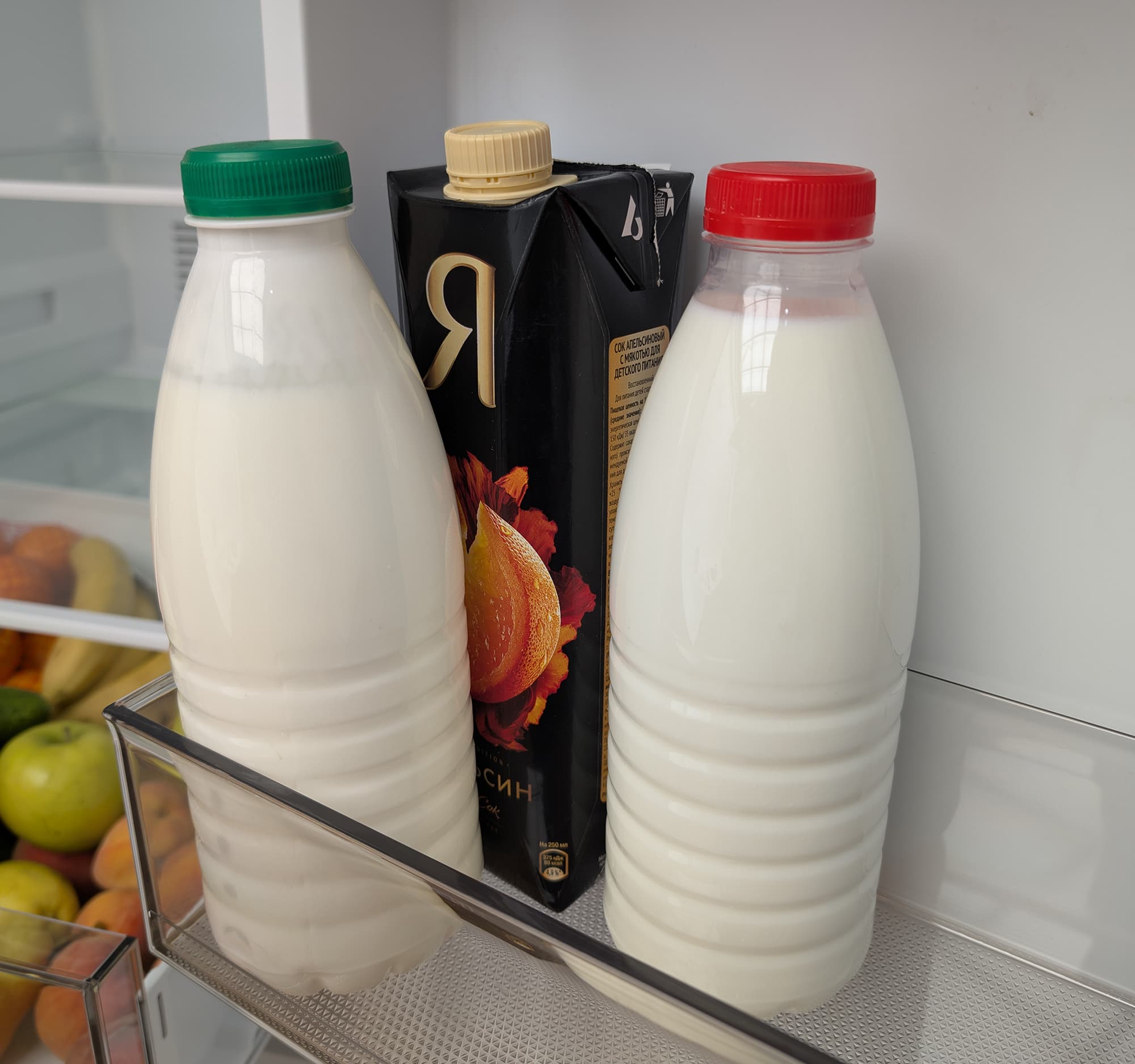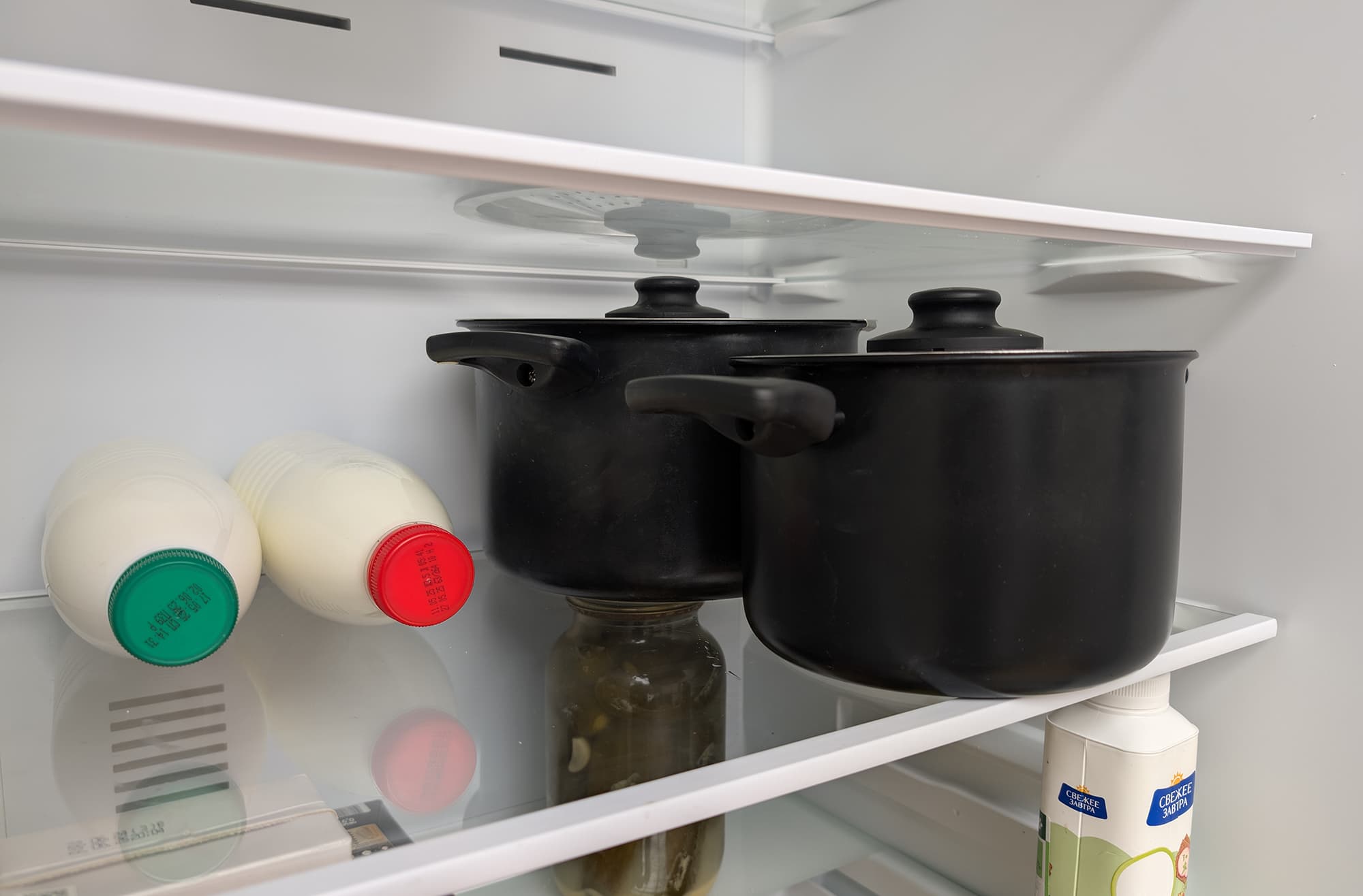 А вот стеклянную банку объемом 1 литр или литровый молочный пакет можно разместить только на нижней полке, над ящиком для овощей.
