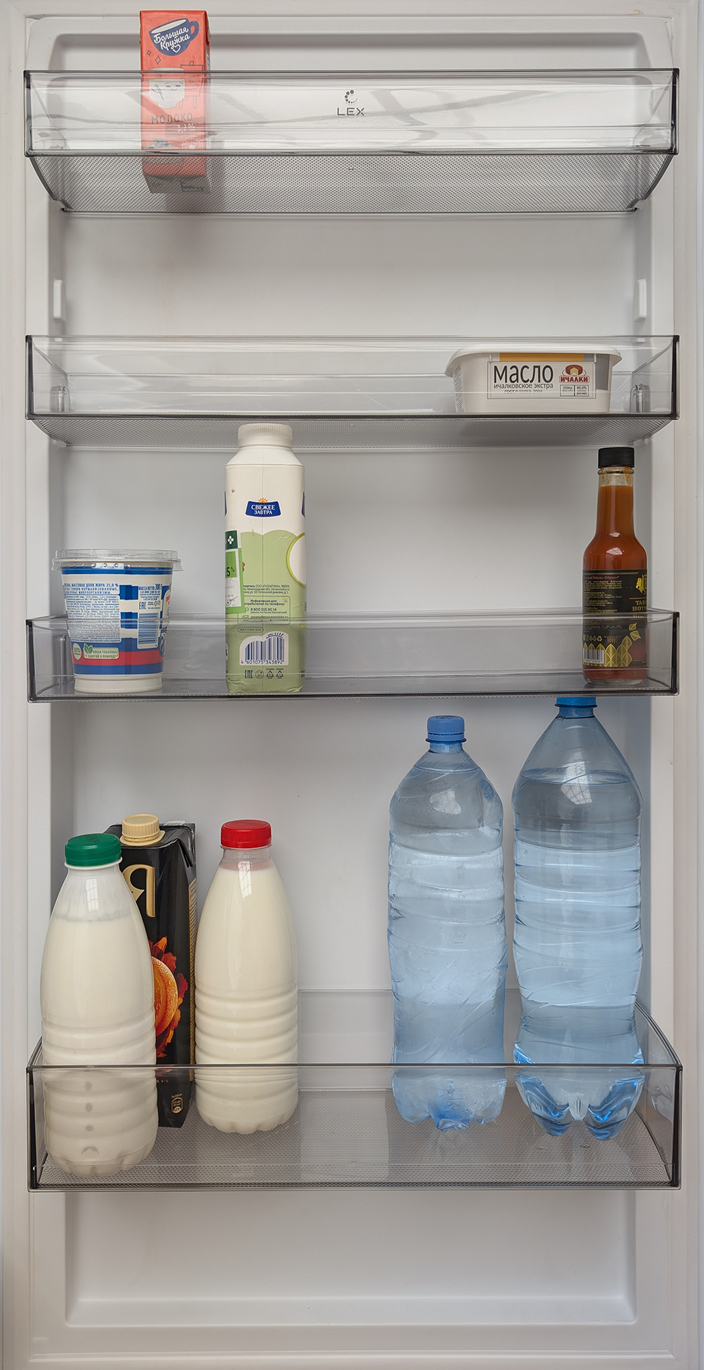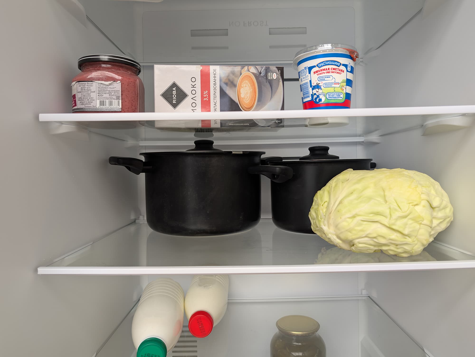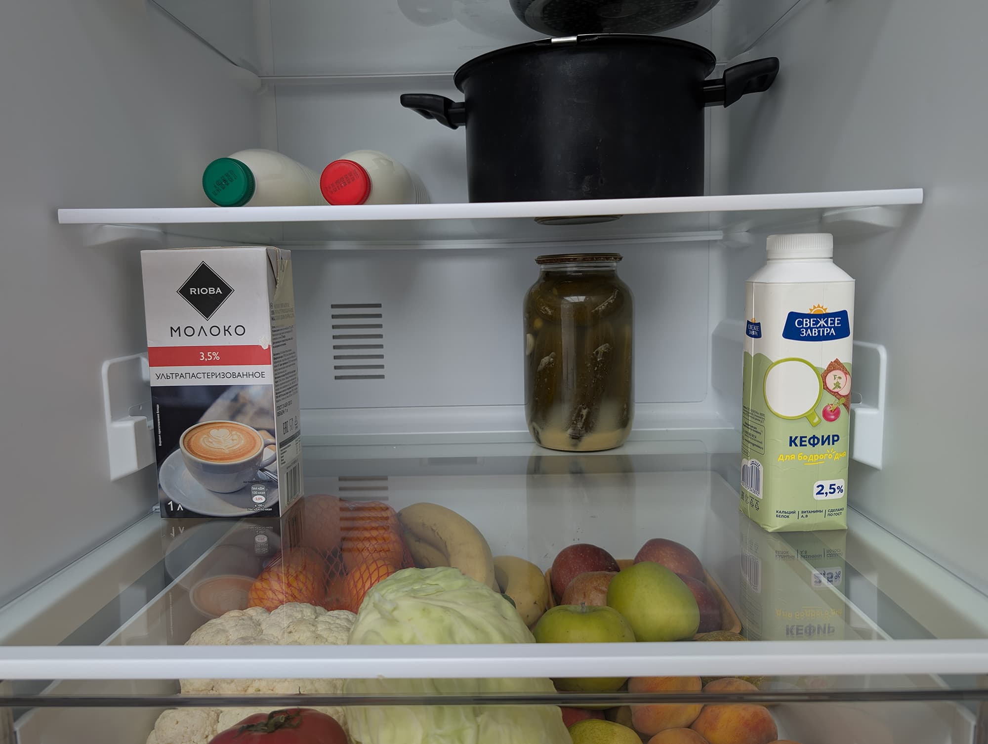 А вот стеклянную банку объемом 1 литр или литровый молочный пакет можно разместить только на нижней полке, над ящиком для овощей.