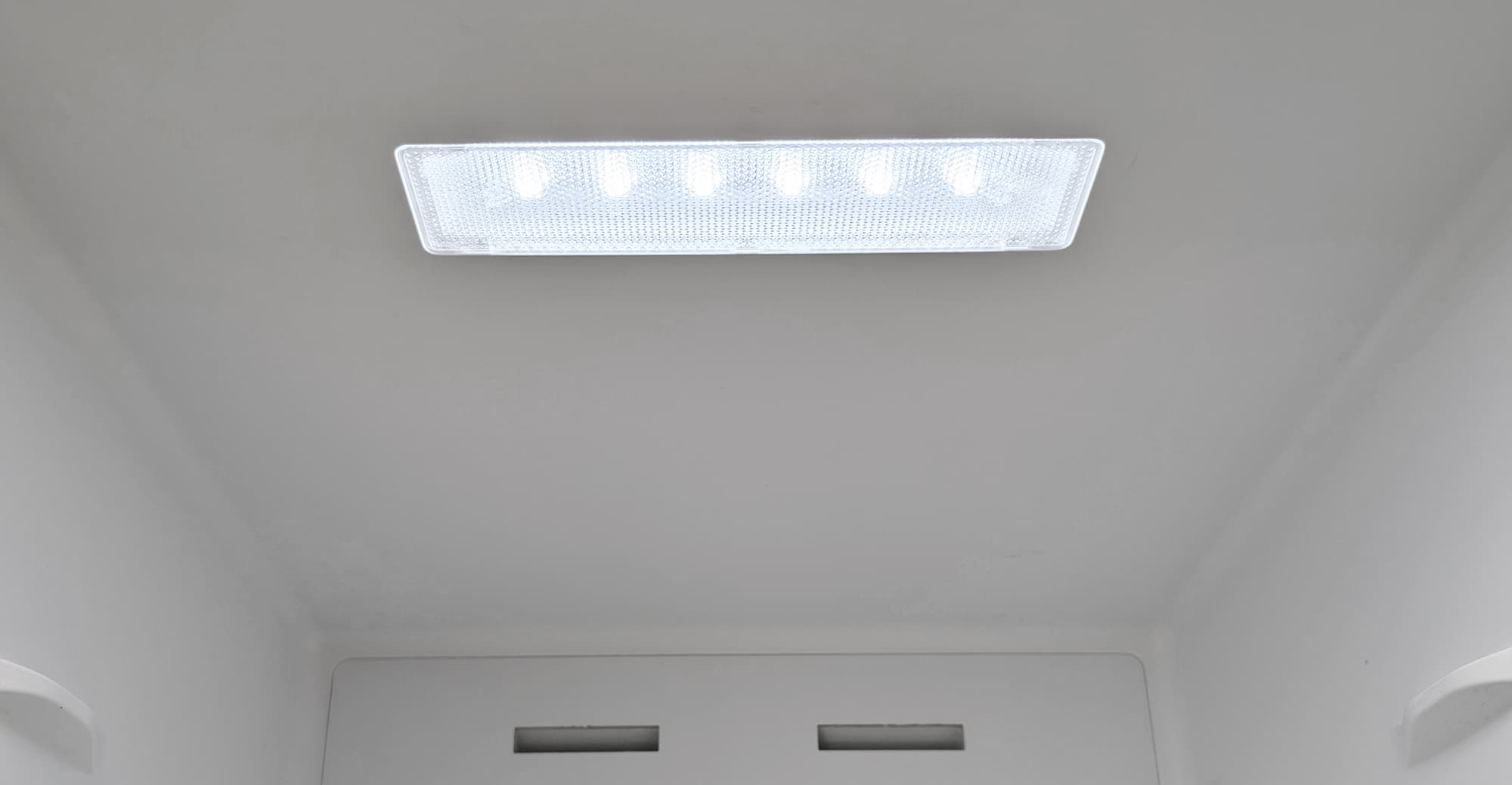 На потолке отделения располагается прямоугольный плафон светодиодной подсветки, дающий яркий холодный свет.