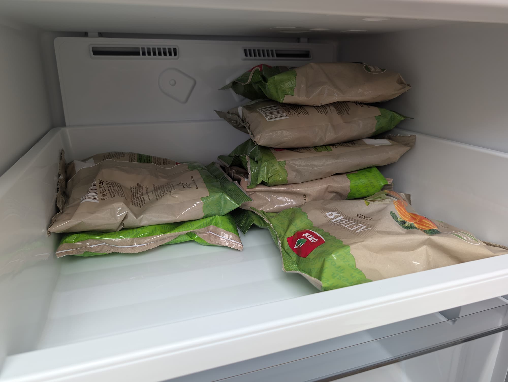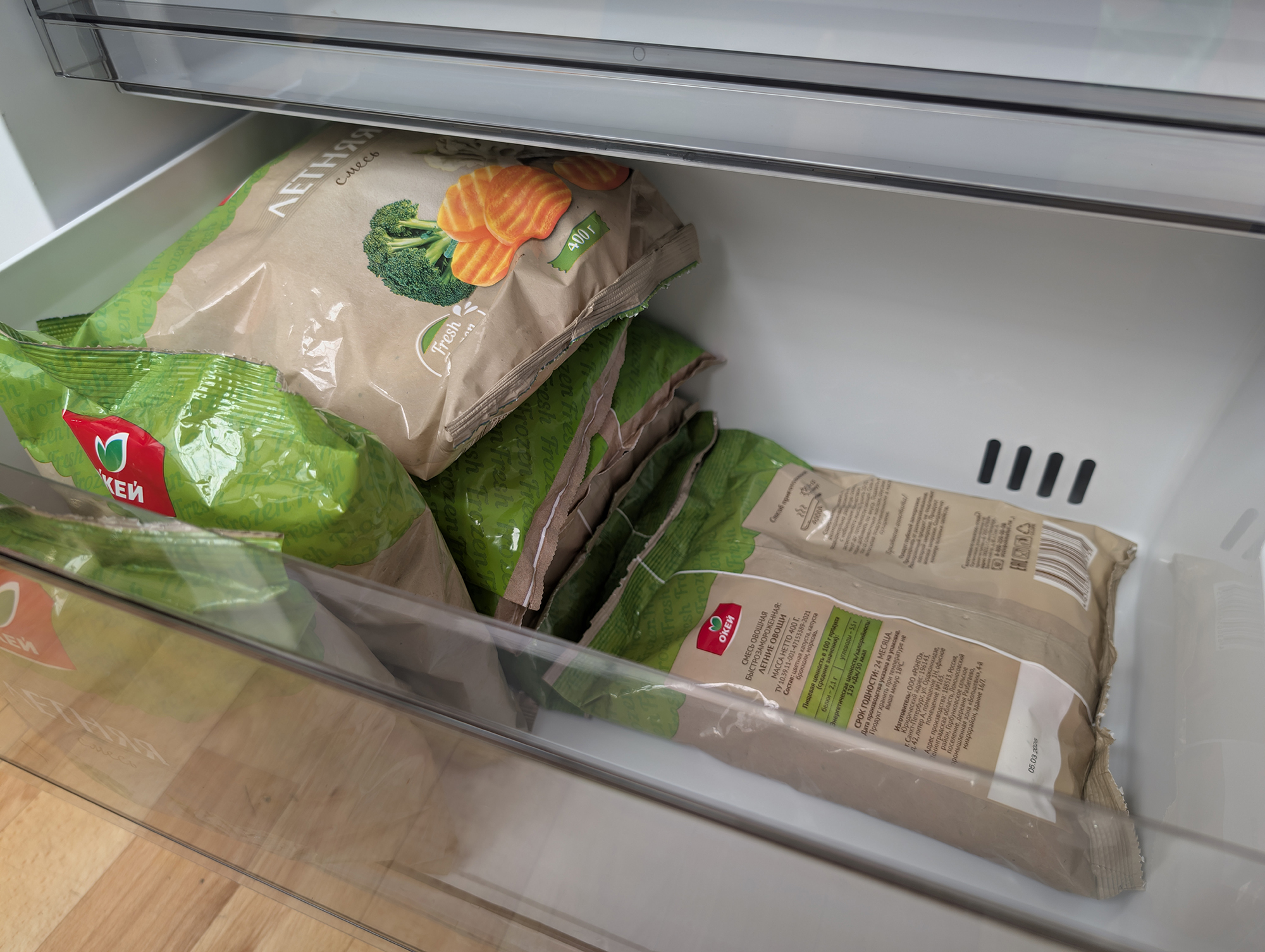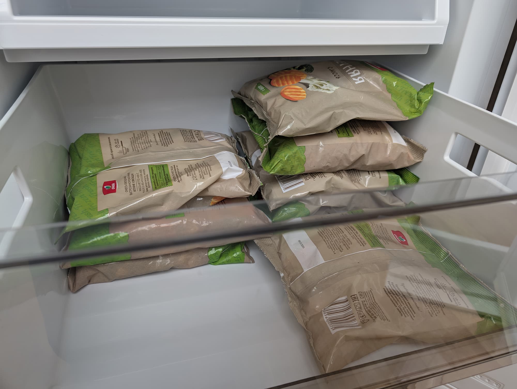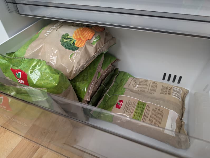 Глубина нижнего ящика чуть меньше из-за ниши холодильного агрегата. Здесь мы можем разместить две стопки по пять пакетов и по паре упаковок вертикально.