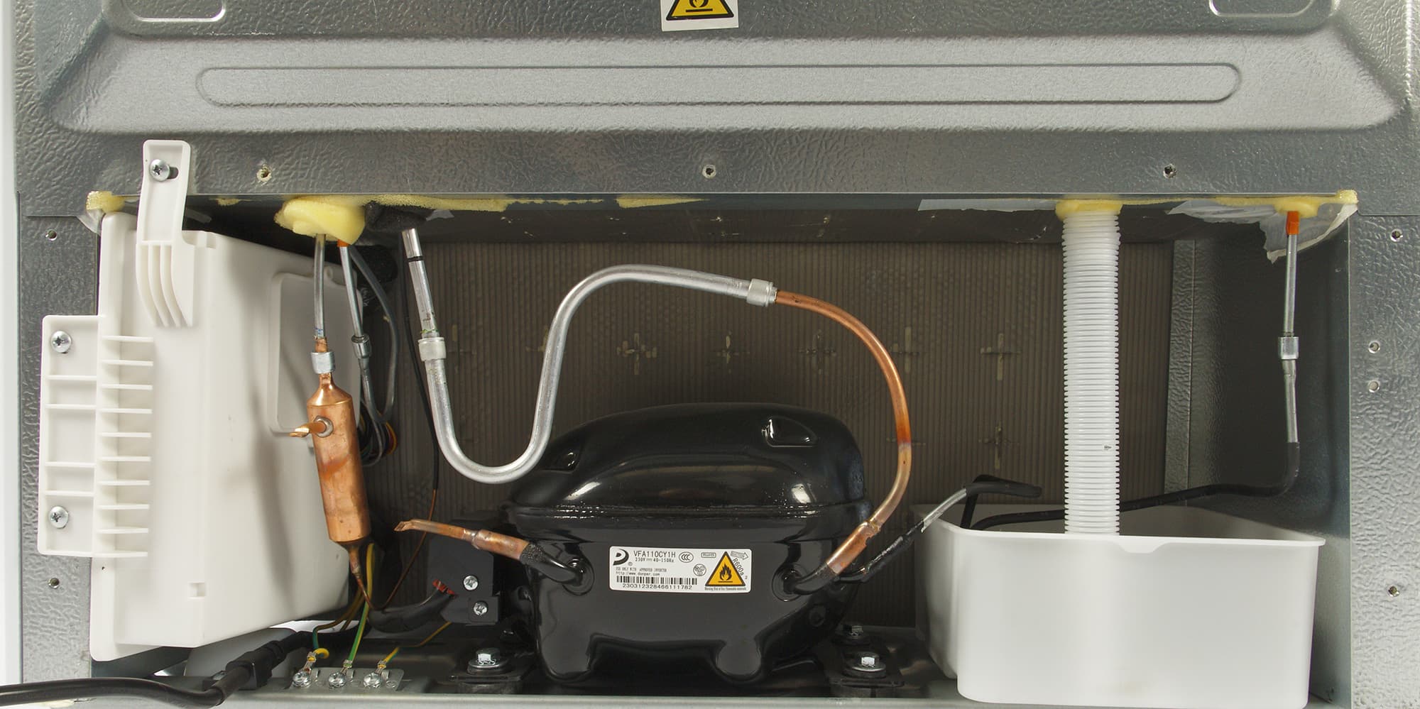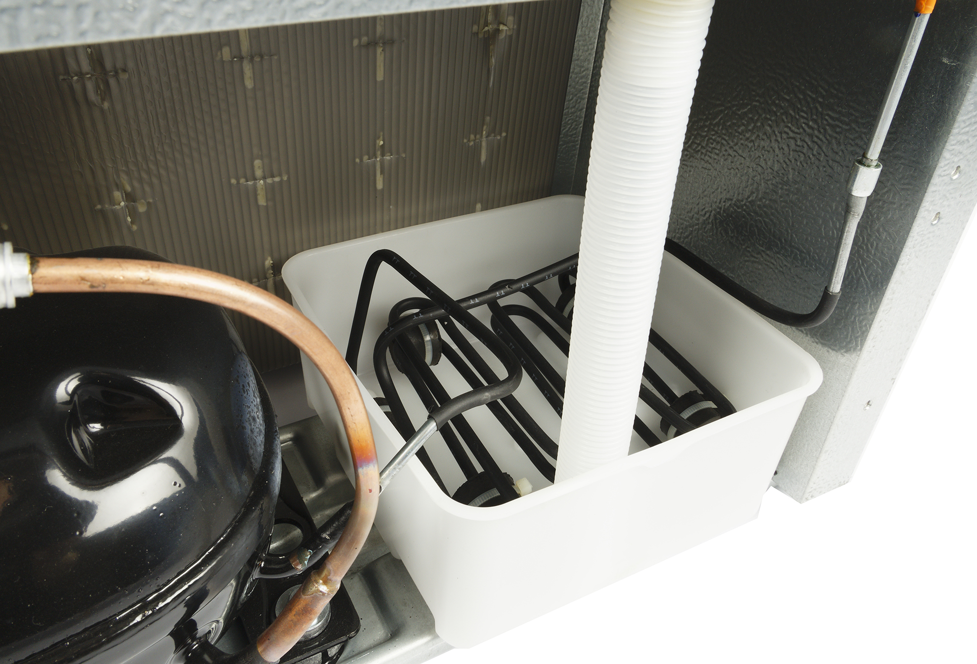 Конденсат, образующийся при работе системы NoFrost, скапливается в пластиковой ванночке справа от компрессора. Жидкость подогревается трубкой, подведенной к змеевику: это улучшает ее испарение.