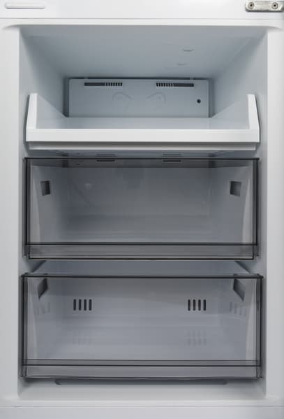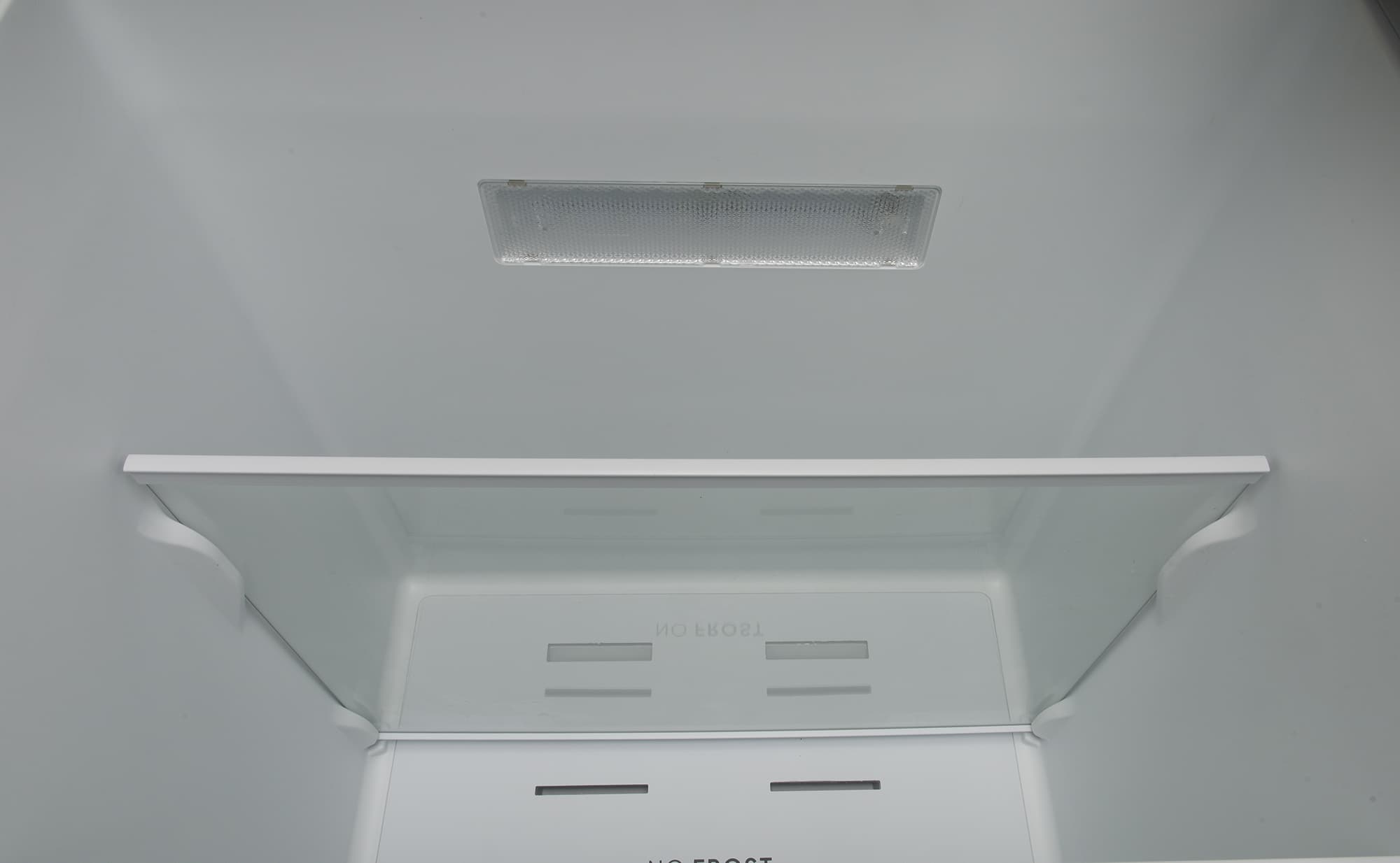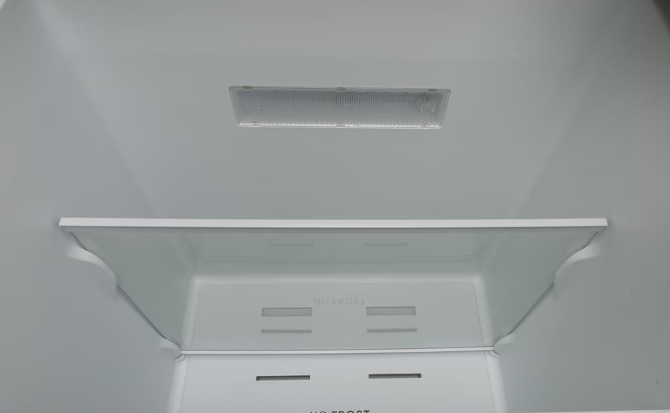Две трети задней стенки морозилки занимает пластиковая фальшпанель, распределяющая поток холода. И холодильное, и морозильное отделения оборудованы системой NoFrost.