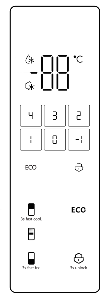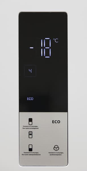 Крупные цифры в верхней части дисплея отображают установленную температуру в холодильном или морозильном отделении. Чтобы изменить установки, следует нажать на соответствующие кнопки в нижней части панели. Последовательными нажатиями можно выбрать температуру в диапазоне от +2 до +8 °C для холодильника и от −16 до −24 °C — для морозилки.
