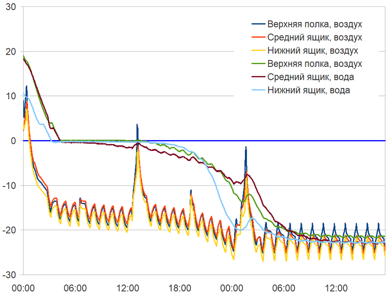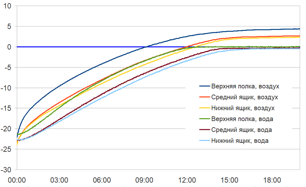 Чтобы оценить замораживающую способность холодильника, мы поместили контейнеры с водой комнатной температуры в средний и нижний ящики морозильной камеры и включили режим максимального охлаждения. Результаты измерений температуры воды и воздуха можно видеть на графике ниже.