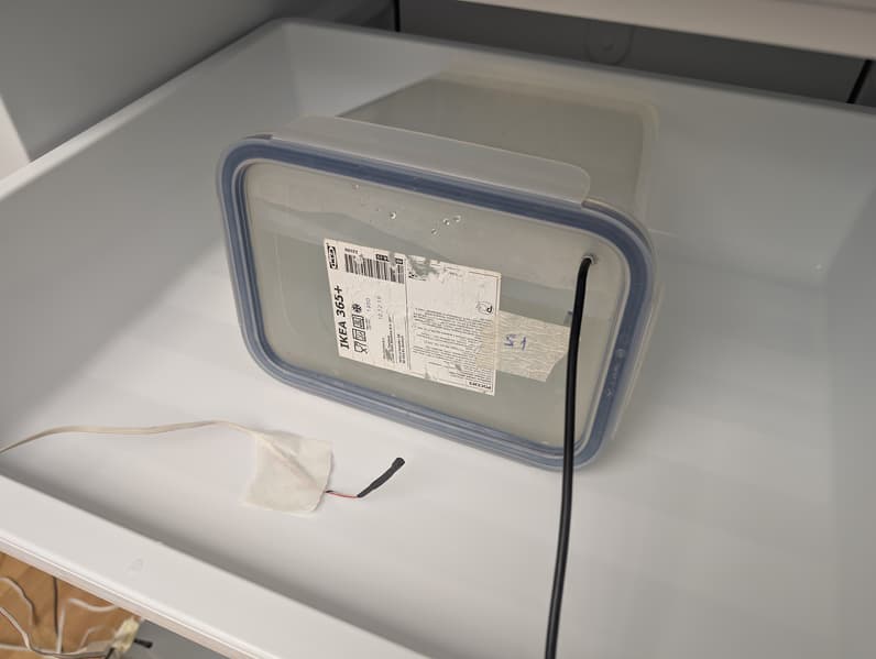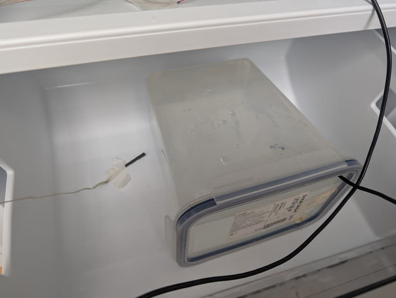 Помимо датчиков температуры воды использовались датчики температуры воздуха. Их мы поместили рядом с контейнерами в те же ящики — так, чтобы поверхность сенсоров не контактировала напрямую с элементами корпуса морозильной камеры.