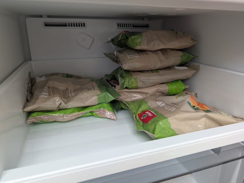 Для оценки емкости морозильной камеры мы по традиции используем 400-граммовые пакеты с замороженными овощами. Объем морозилки у Lex LKB201WIDMax весьма внушительный: на верхней полке без труда размещается четыре стопки по пять стандартных упаковок — итого двадцать штук. При плотной укладке сюда можно добавить еще четыре пакета.