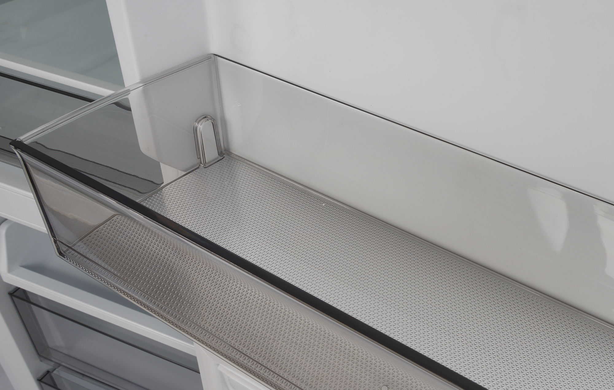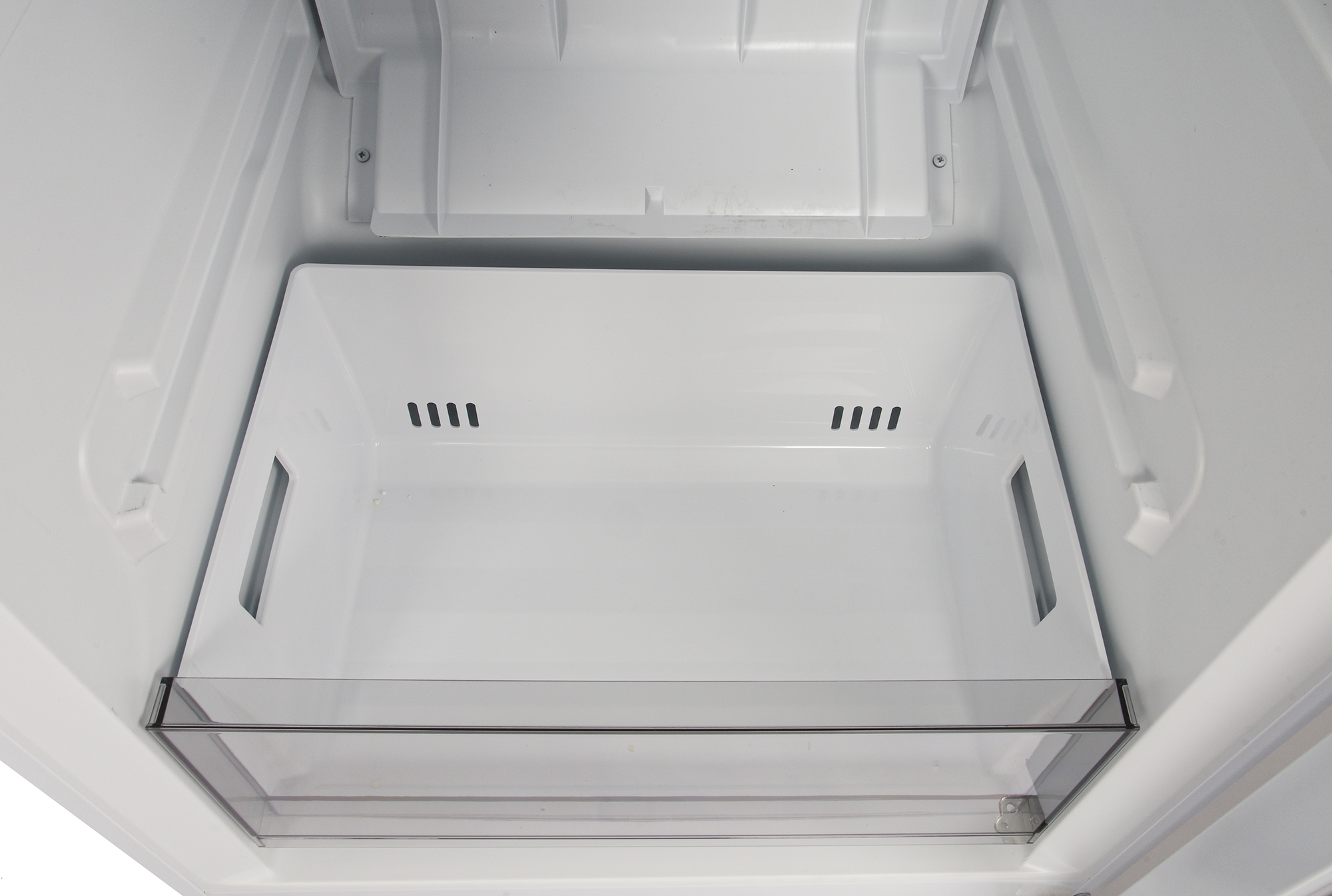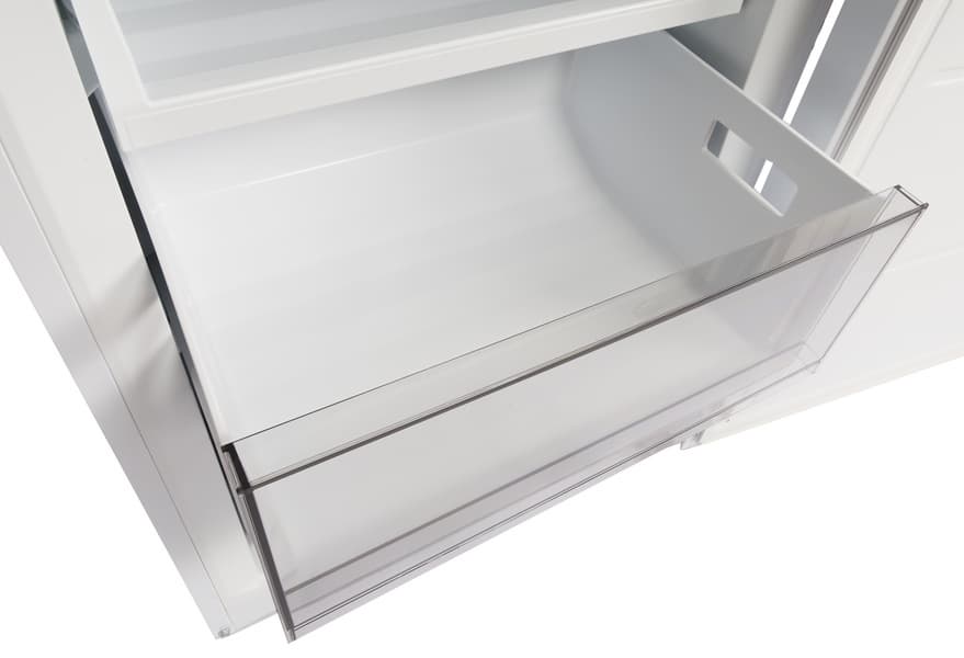 Ящик для овощей и фруктов сделан из белого пластика, передняя стенка — прозрачная. Каких-либо разделителей или органайзеров в емкости нет.