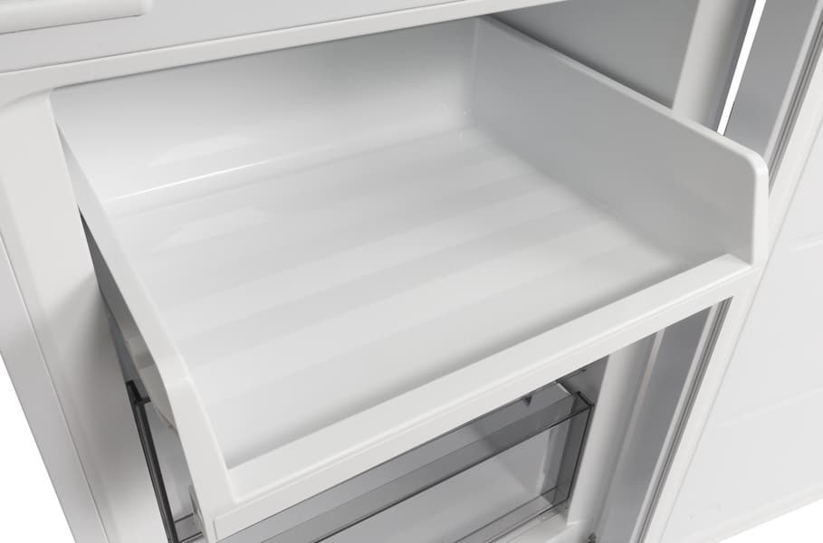 Внутри морозильного отделения — большая верхняя полка-лоток и два ящика. Конструкция лотка обеспечивает удобное хранение крупных предметов: коробок с замороженной пиццей, больших кусков мяса и рыбы и объемных контейнеров с заготовками.