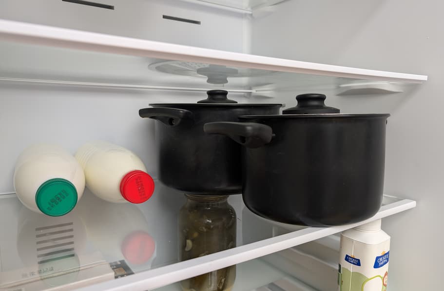 Глубина полок позволяет разместить рядом трех- и пятилитровую кастрюли — не только поперек камеры, но и вдоль нее. Оставшегося места вполне достаточно для беспрепятственного закрытия дверцы.