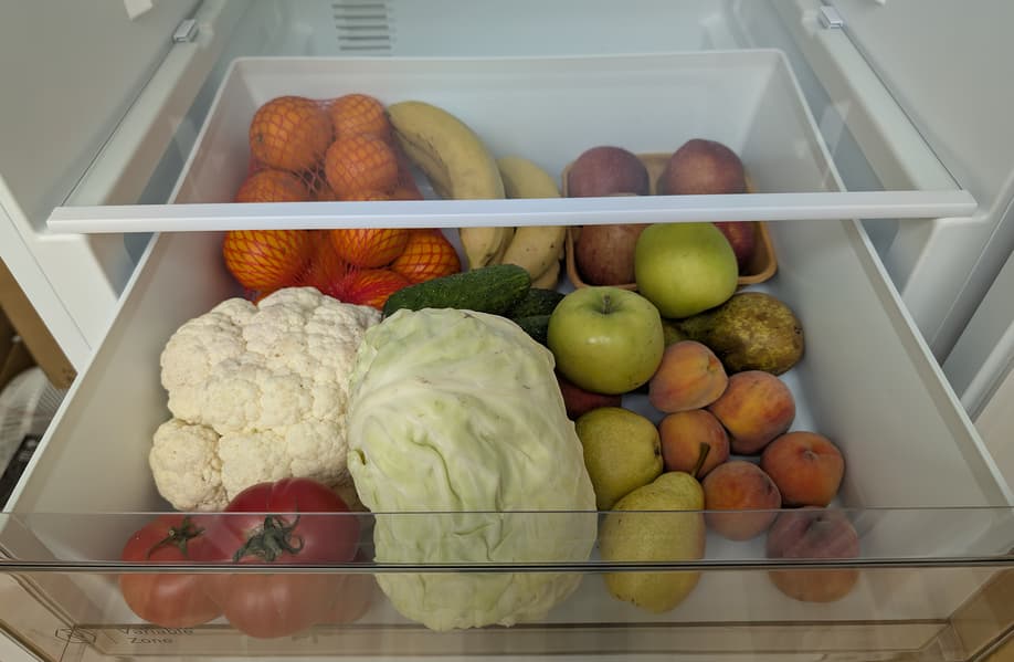 Наиболее ровный микроклимат — в зоне свежести. Перепад температуры и влажности здесь меньше всего, что позволяет сохранять зелень, фрукты и овощи свежими. При необходимости ящик можно использовать и для бережной разморозки замороженного мяса и рыбы.