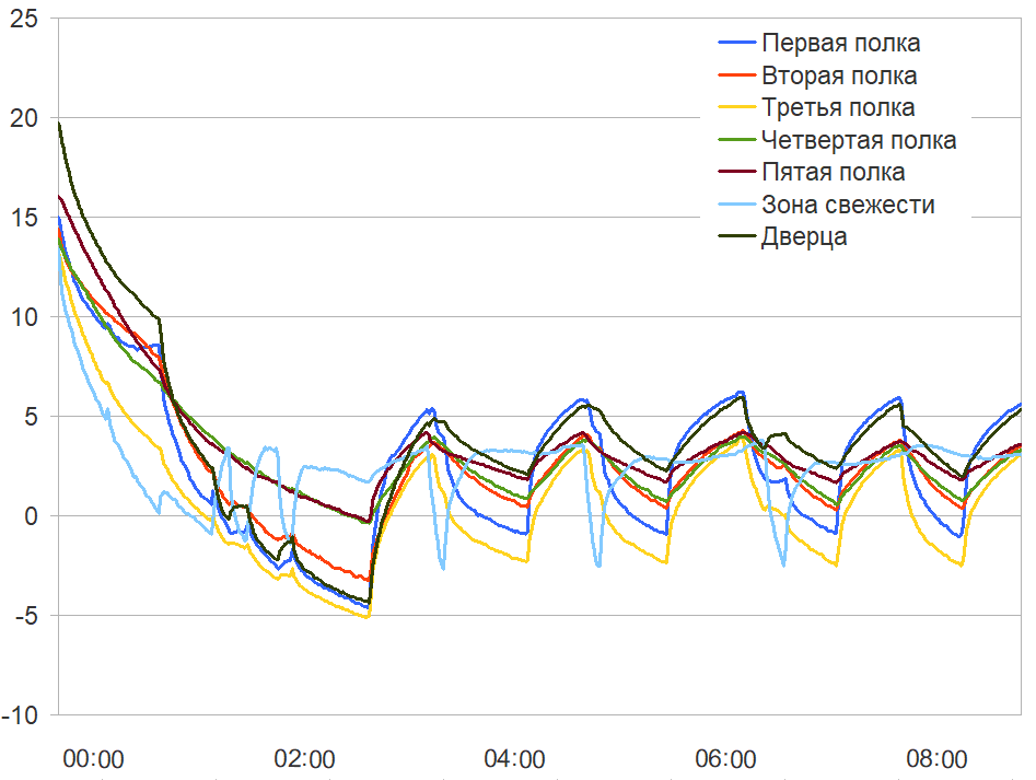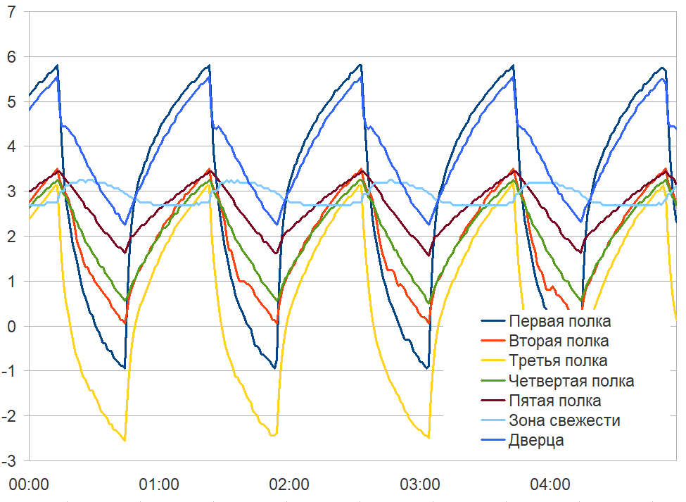 Считаем необходимым еще раз подчеркнуть, что приведенные графики иллюстрируют не потребительские качества холодильника, а особенности логики работы холодильного агрегата и циркуляции холодного воздуха между зонами камеры. Не следует удивляться таким, на первый взгляд, существенным колебаниям: охлажденные продукты обладают значительно большей тепловой инерцией, нежели воздух в камере, и переносят циклические изменения температуры нормально.