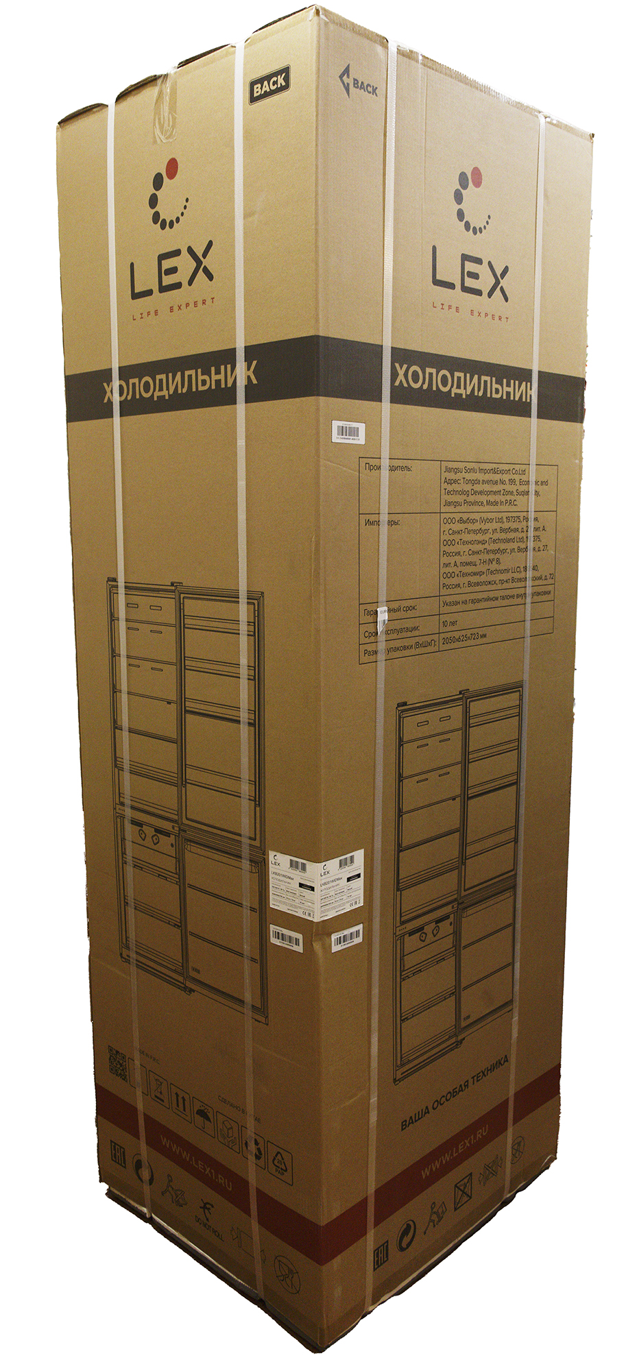 Холодильник поставляется в картонной коробке, оформленной в фирменном стиле производителя: заметный логотип, векторные изображения устройства на боковых сторонах и непременный слоган «Ваша особая техника».