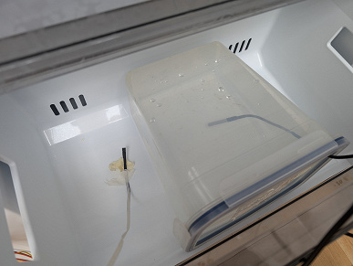 Три термодатчика в герметичном исполнении были размещены в трех четырехлитровых пластиковых контейнерах. Емкости мы наполнили водой и поставили в морозилку: одну на верхнюю полку, вторую — в средний ящик и третью — в нижний.