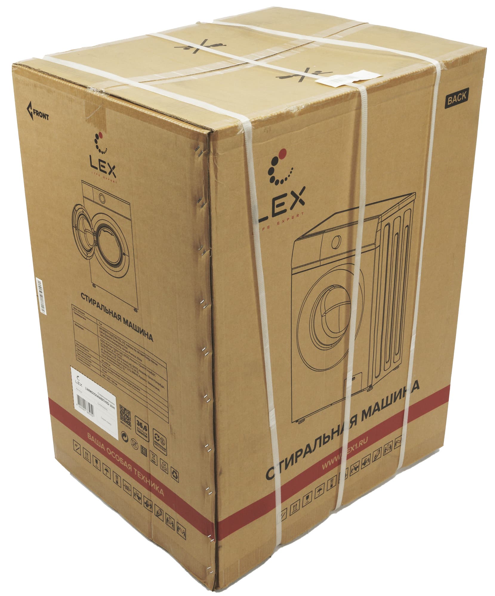 Упаковка из картона и пенопласта, в которой поставляется Lex LWM07014WBTHID, не содержит никакой значимой для пользователя информации: мы видим только логотип производителя, схематические изображения абстрактной стиральной машины, контактные данные изготовителя и транспортировочные инструкции. Индекс модели и серийный номер приведены на небольшой бумажной наклейке.