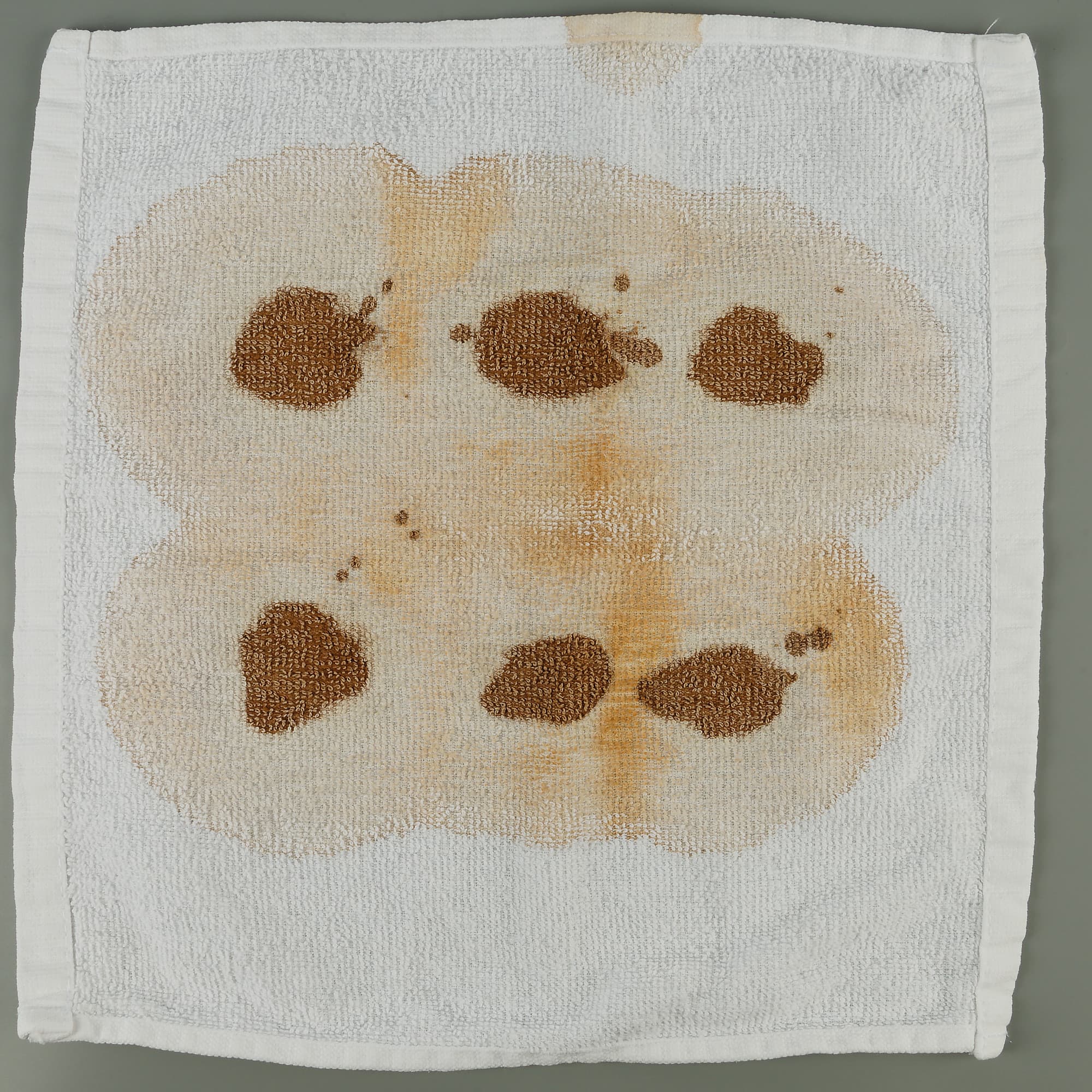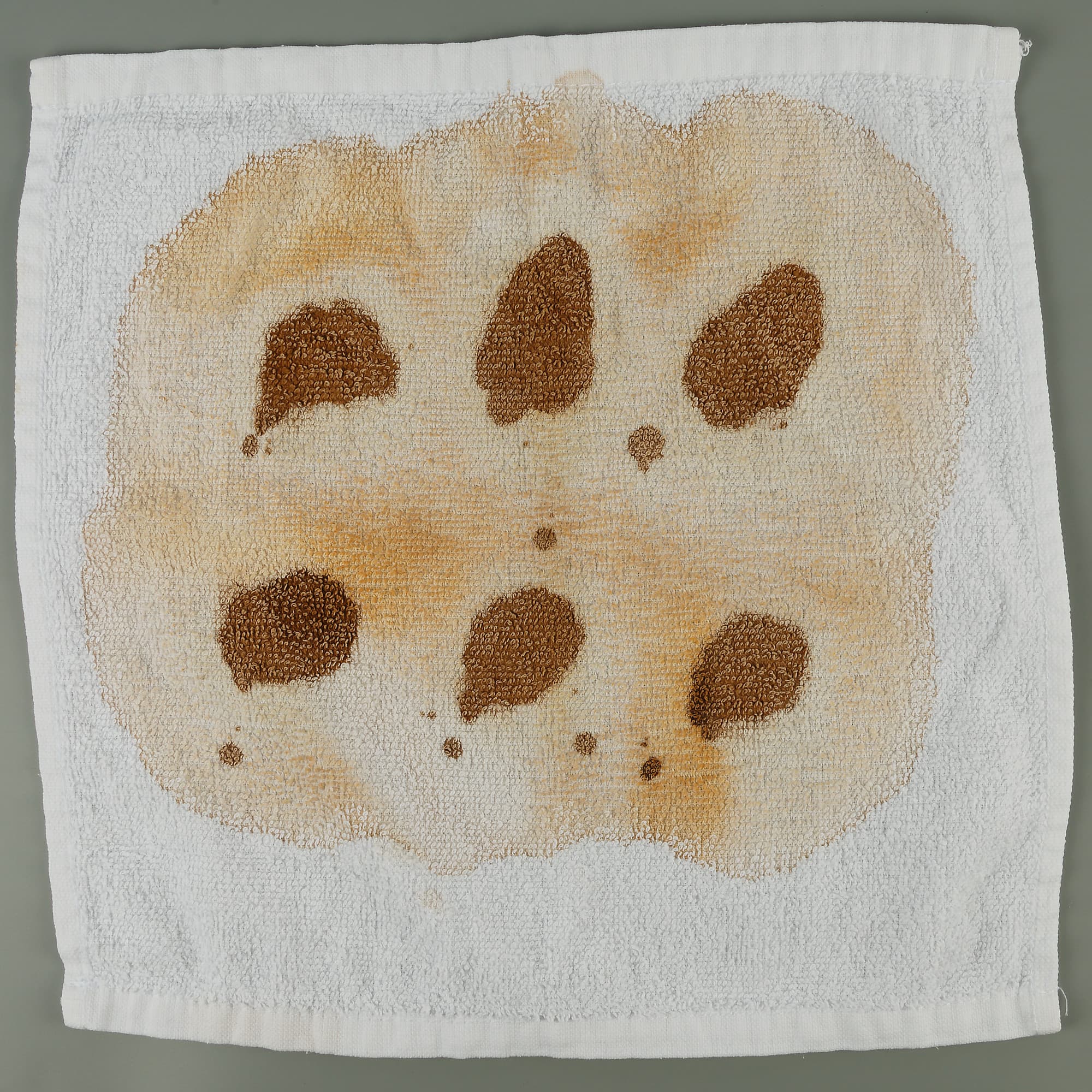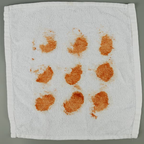 Как обычно, мы взяли красное вино, кетчуп, соевый соус и какао. Эти продукты мы нанесли на белые махровые салфетки из хлопка и выдержали ткань с разными «рисунками» в течение суток, чтобы пятна высохли и задача стала потруднее.