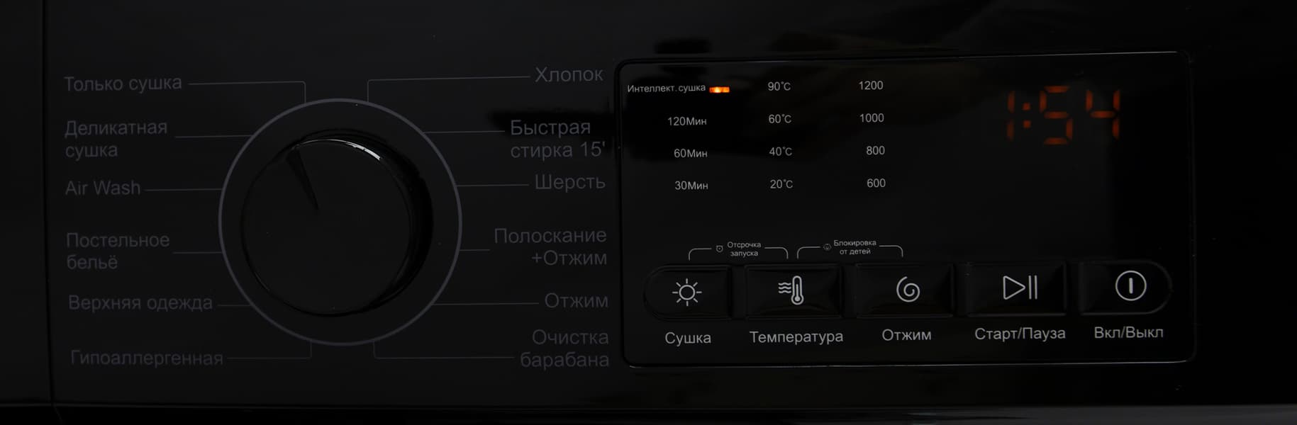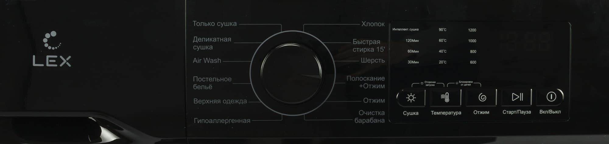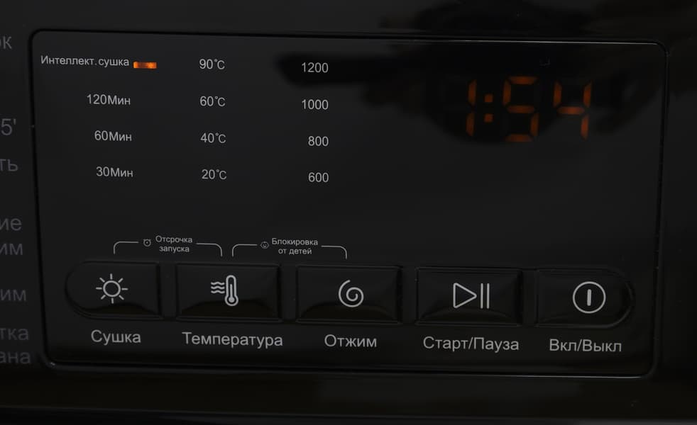 - Сушка устанавливает время, в течении которого будет сушиться белье — 30, 60 или 120 минут. Также доступен режим «интеллект сушка», описания которого, впрочем, в инструкции мы не нашли