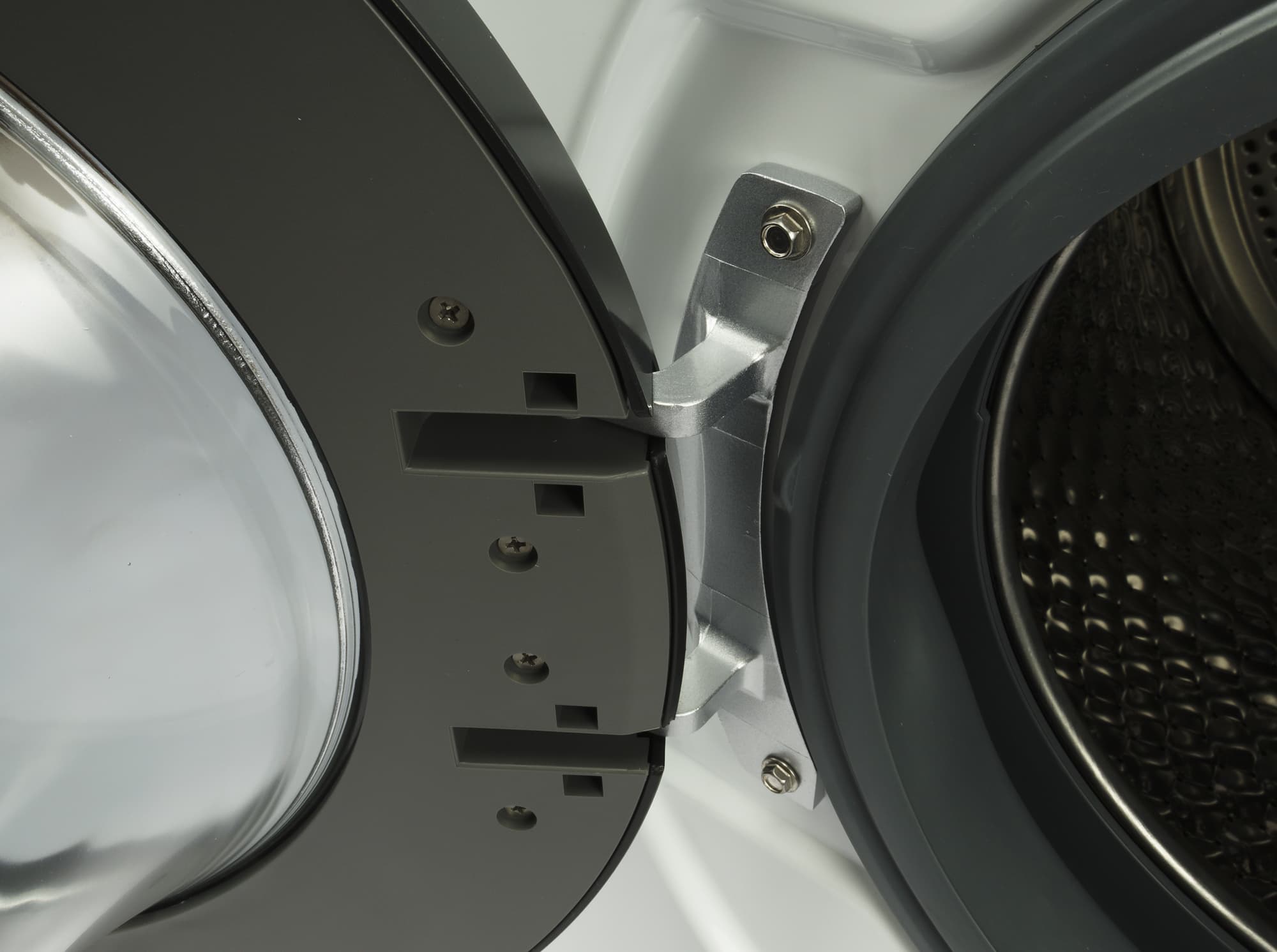 Петли люка у этой модели металлические. Их конструкция позволяет распахнуть дверцу довольно широко, примерно на 150°. Фиксатор замка силуминовый, ответная часть защелки пластиковая. Переставить крышку так, чтобы она открывалась в другую сторону, не получится — не предусмотрено конструкцией.