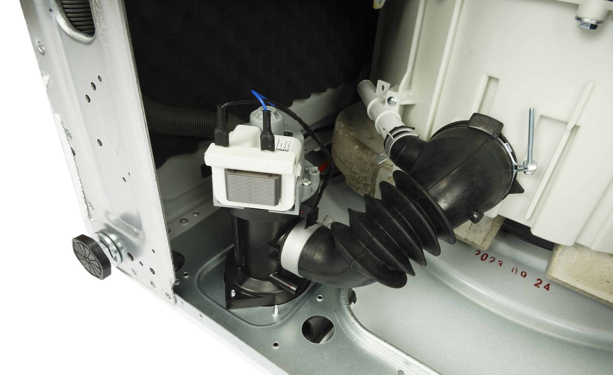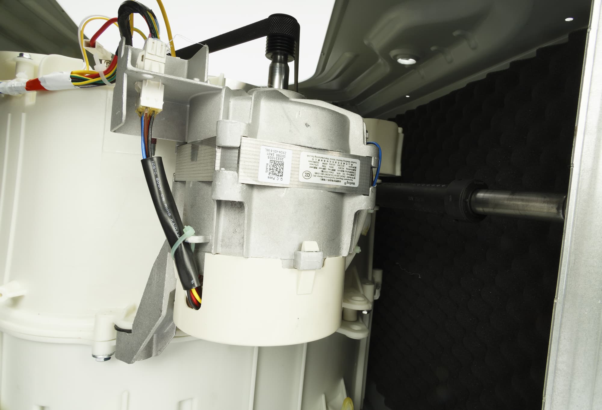 При перевозке барабан фиксируется четырьмя винтами с пластиковыми пробками и амортизаторами из плотной черной резины. Когда машину уже поставили на место, их надо вывинтить и закрыть отверстия пластиковыми заглушками — они есть в коробке.