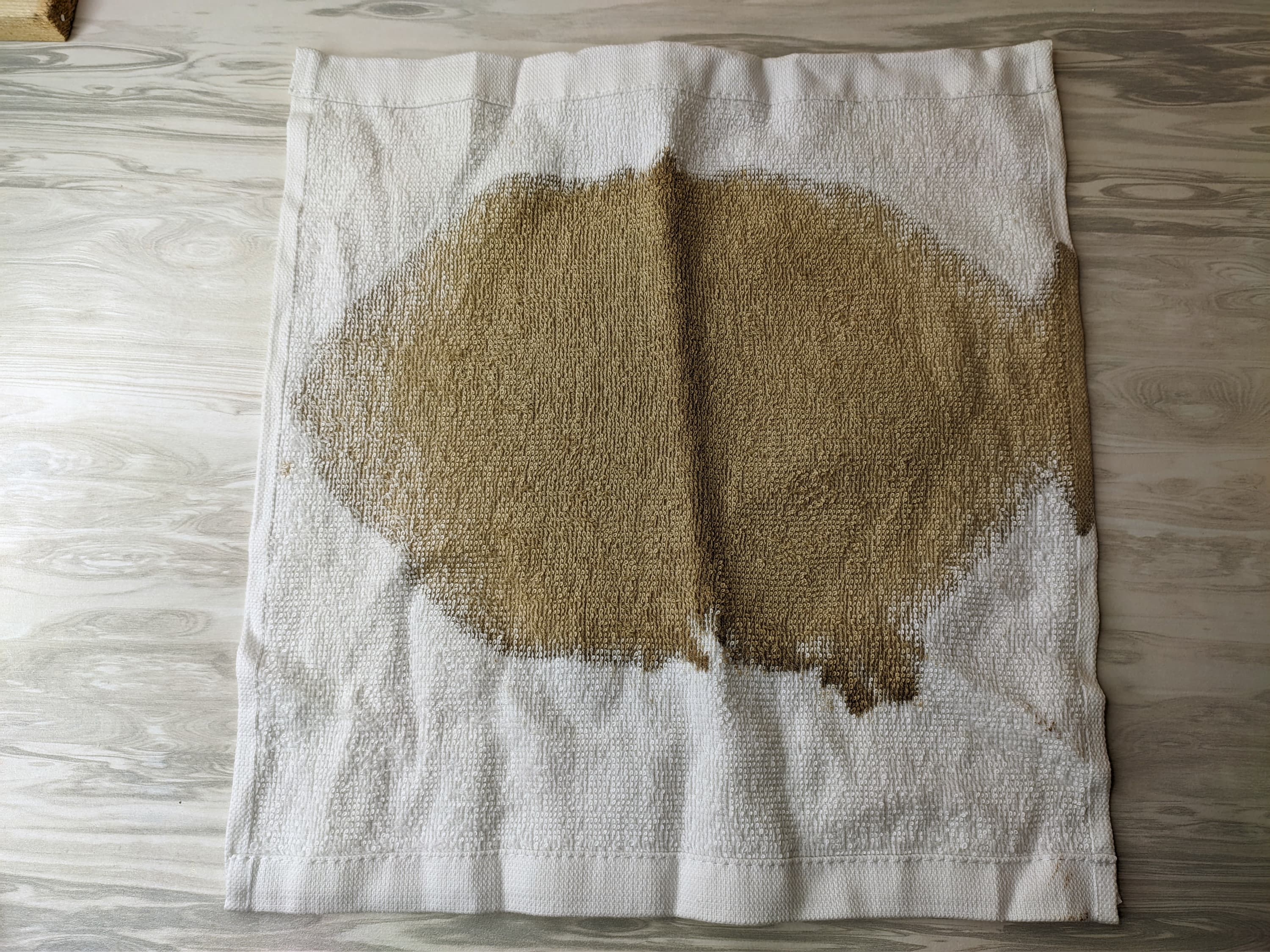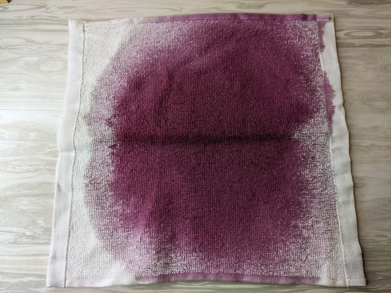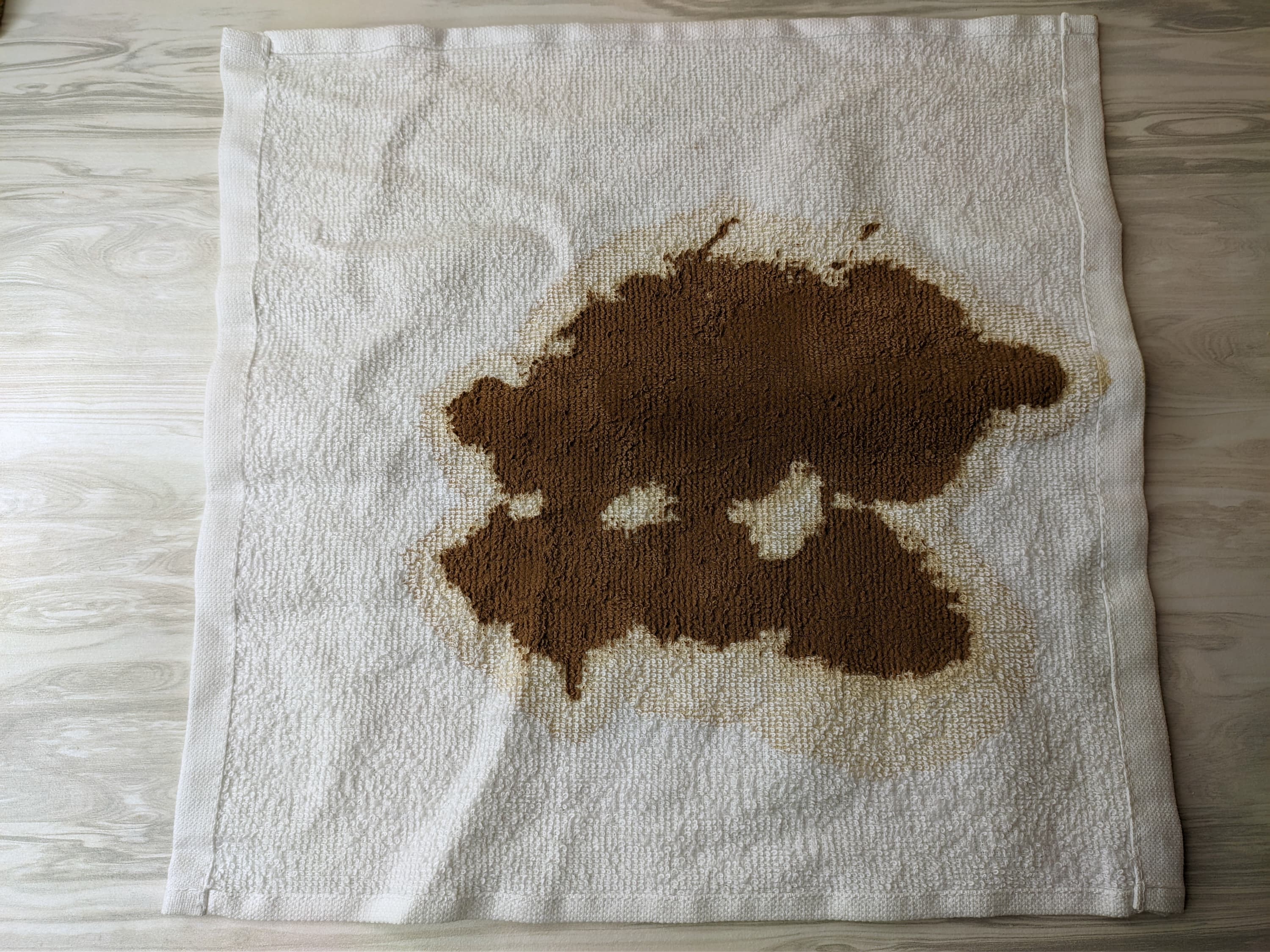 На каждое из полотенец мы нанесли по одному из наших любимых веществ, главные принцип в подборе которых прост: оно должно быть распространенным и стойко сопротивляться стирке. Это красное вино, соевый соус, кетчуп и какао. Грязные полотенца сутки сохли и только после этого попали в стирку.