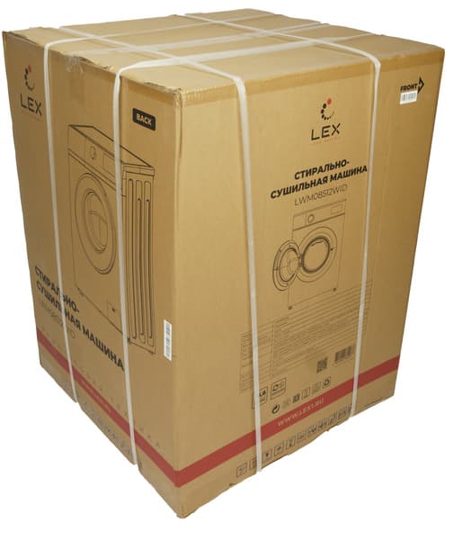 Стирально-сушильная машина поставляется в коробке из технического коричневого картона. Внутренности защищены от ударов с помощью пенопластовых вкладок, коробка обтянута прочными полиэтиленовыми лентами.