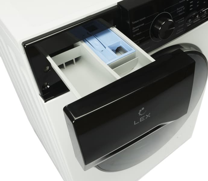 Отсек для моющих средств стандартен для стиралок Lex. Слева находится лоток для стирального порошка либо жидкого моющего средства и отбеливателя. Справа находится отсек, куда помещается средство для замачивания. А за ним отсек для кондиционера. Специальных ванночек или приспособлений для жидких моющих средств у этой модели нет. Лоток фиксируется защелкой голубого цвета. Достать его для чистки и обслуживания можно без труда.