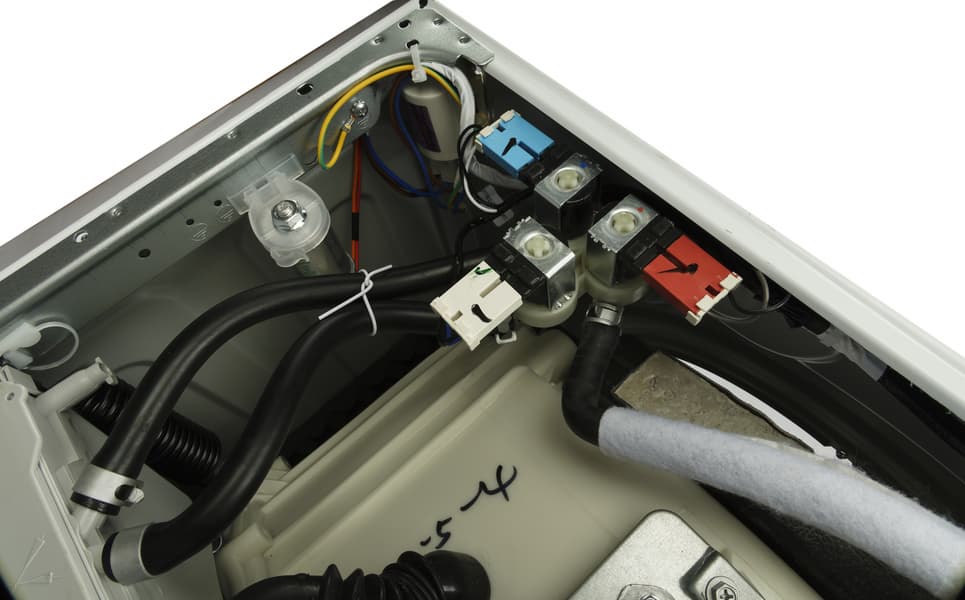 Сливной шланг уже установлен и закреплен в специальных держателях на задней панели. В левом верхнем углу расположена розетка для заливного шланга, снабженная сетчатым фильтром от ржавчины. Эта модель, как и большинство стиралок, рассчитана на подключение только к холодному водоснабжению.