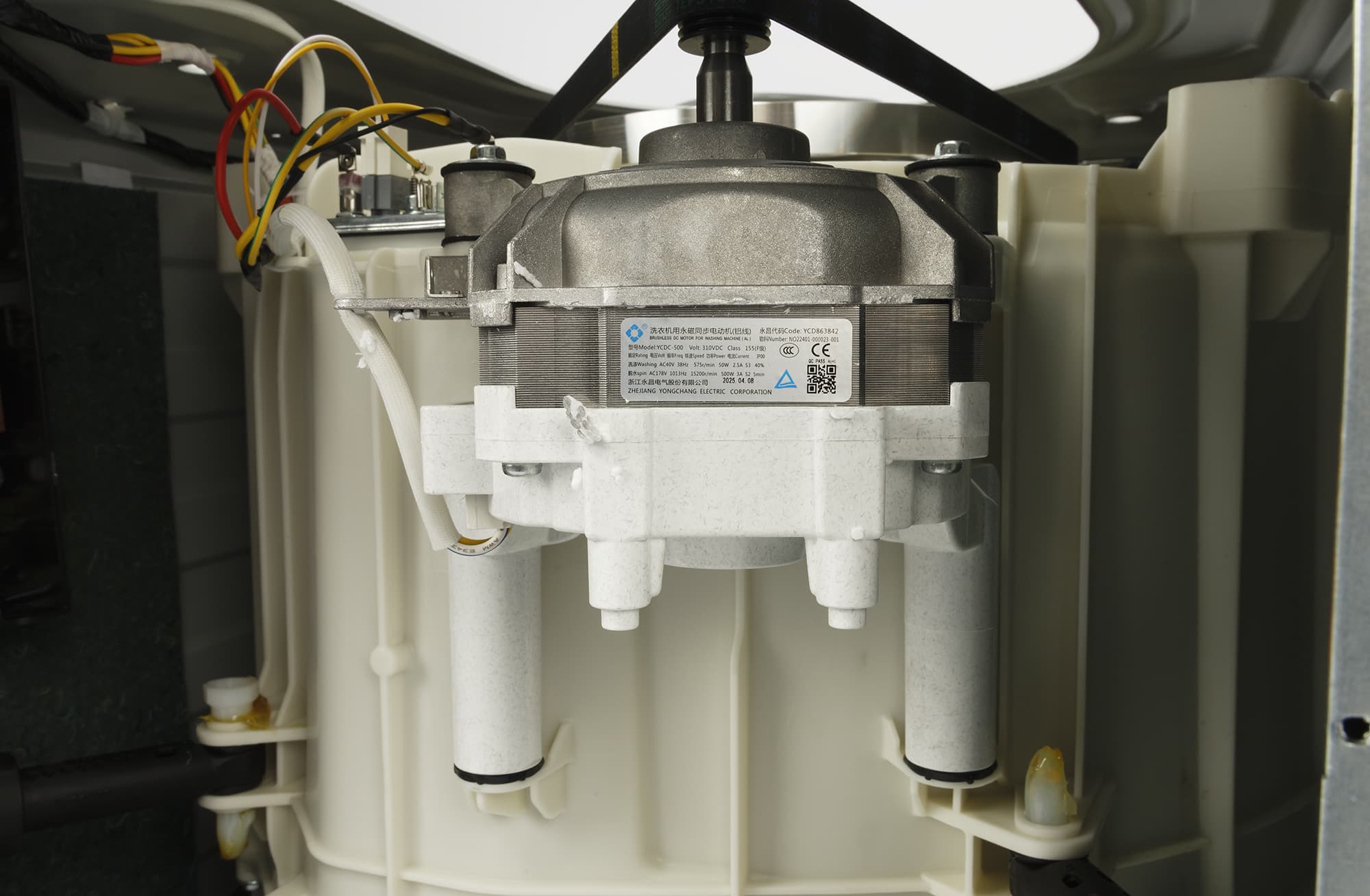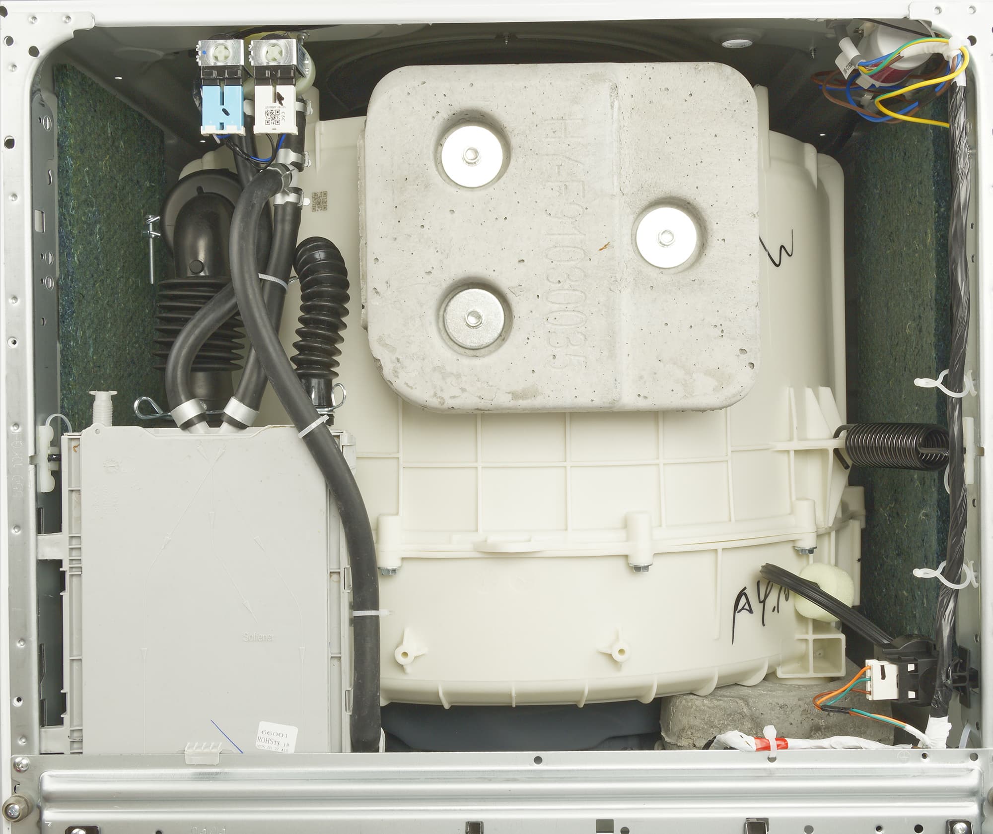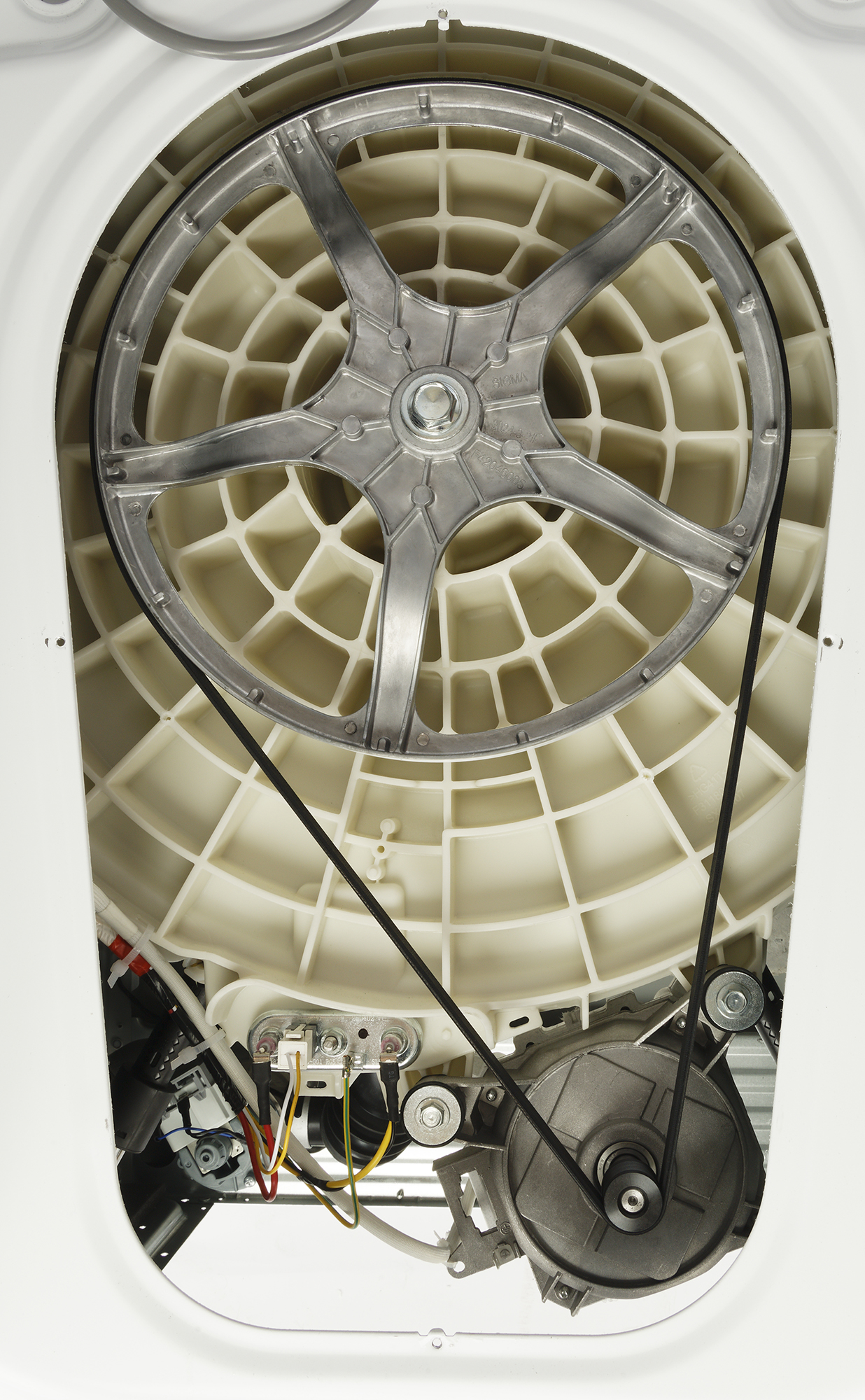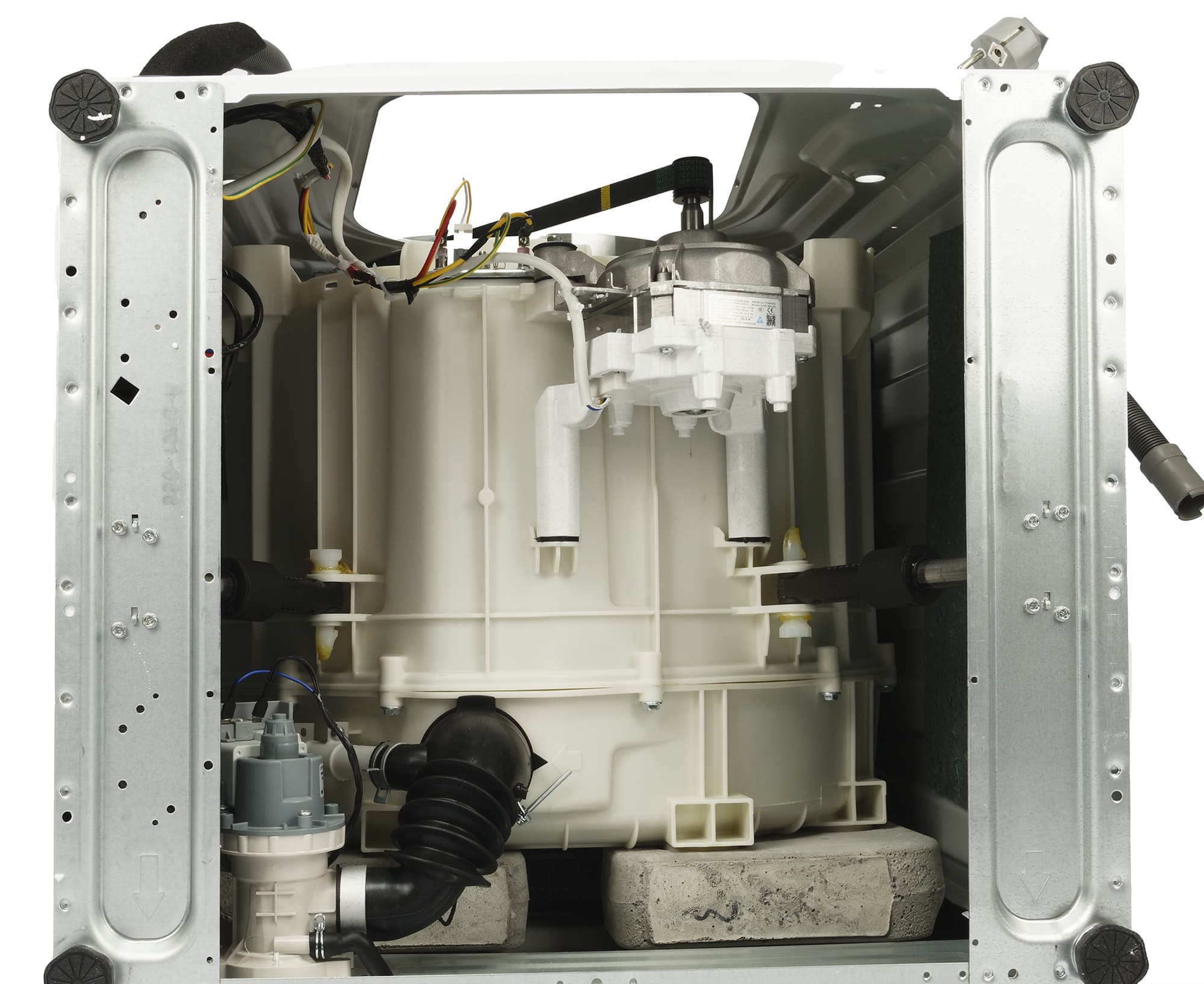 Сняв заднюю крышку, мы убедились, что эта модель оснащена инверторным бесщеточным приводом. Это дает машинке ряд преимуществ перед устройствами с прямым приводом: более высокая энергоэффективность, более тихая работа (меньше вибраций), более длительный срок службы и более широкий диапазон режимов стирки. В такой конструкции есть и слабые места — наличие ременной передачи, которая может изнашиваться и требовать замены.