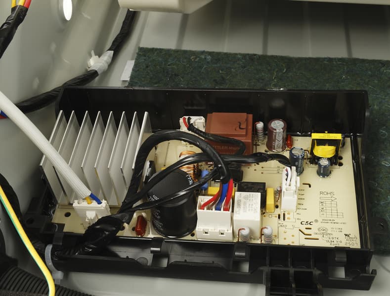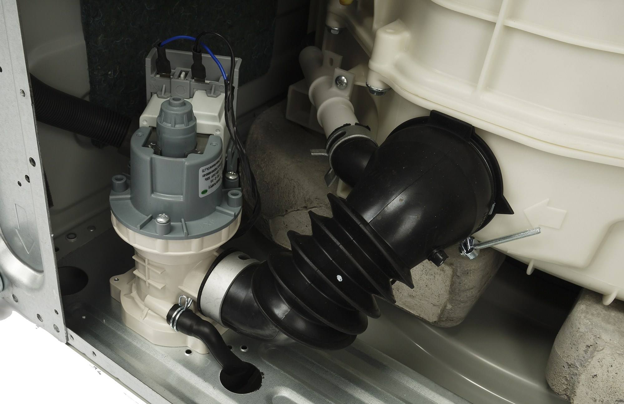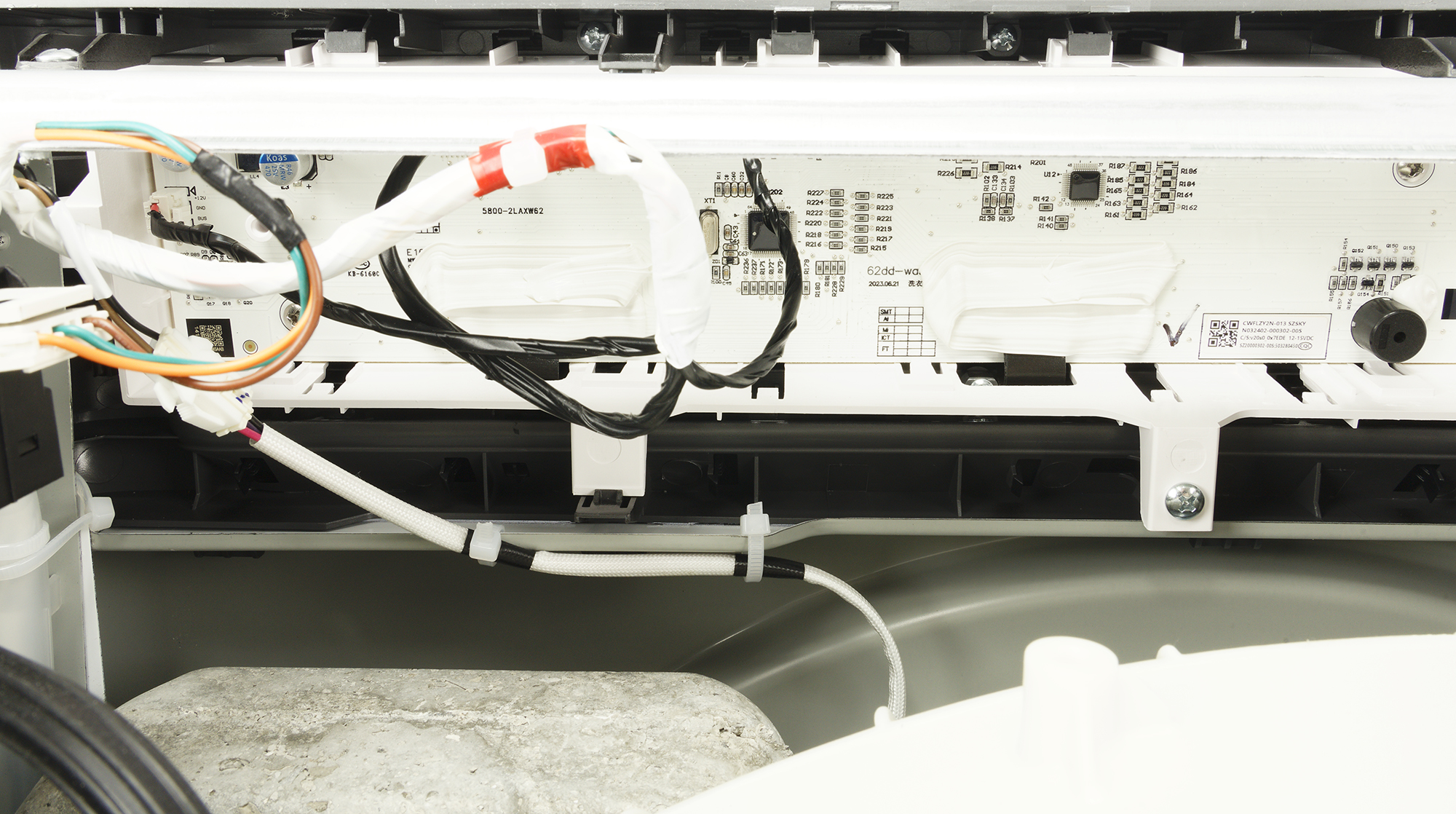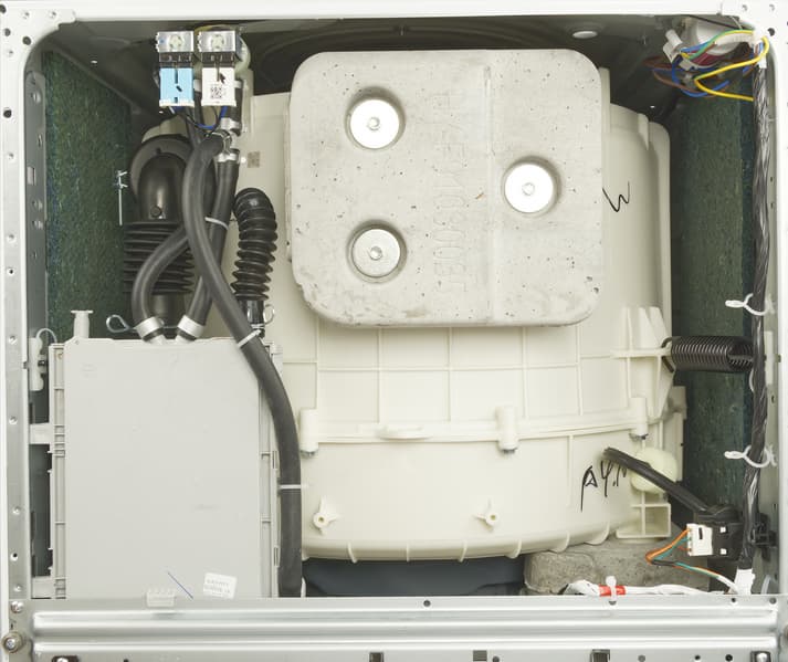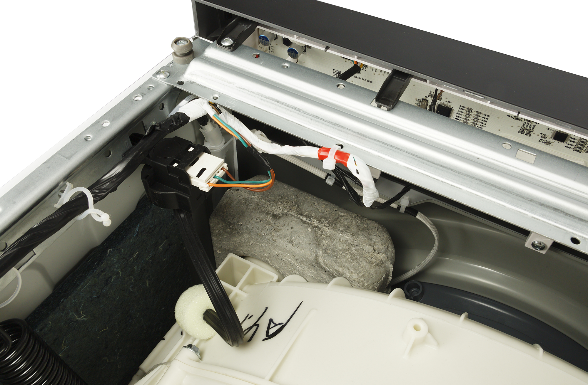 Сняв заднюю крышку, мы убедились, что эта модель оснащена инверторным бесщеточным приводом. Это дает машинке ряд преимуществ перед устройствами с прямым приводом: более высокая энергоэффективность, более тихая работа (меньше вибраций), более длительный срок службы и более широкий диапазон режимов стирки. В такой конструкции есть и слабые места — наличие ременной передачи, которая может изнашиваться и требовать замены.