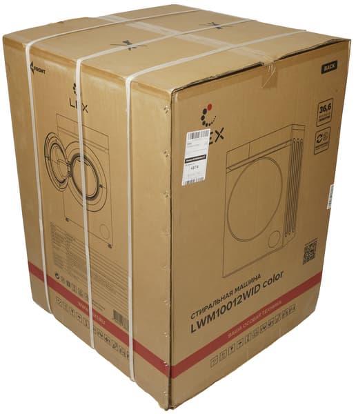 Стиральная машина прибыла к нам в крупной коробке из гофрированного картона, обтянутой капроновыми стропами.
