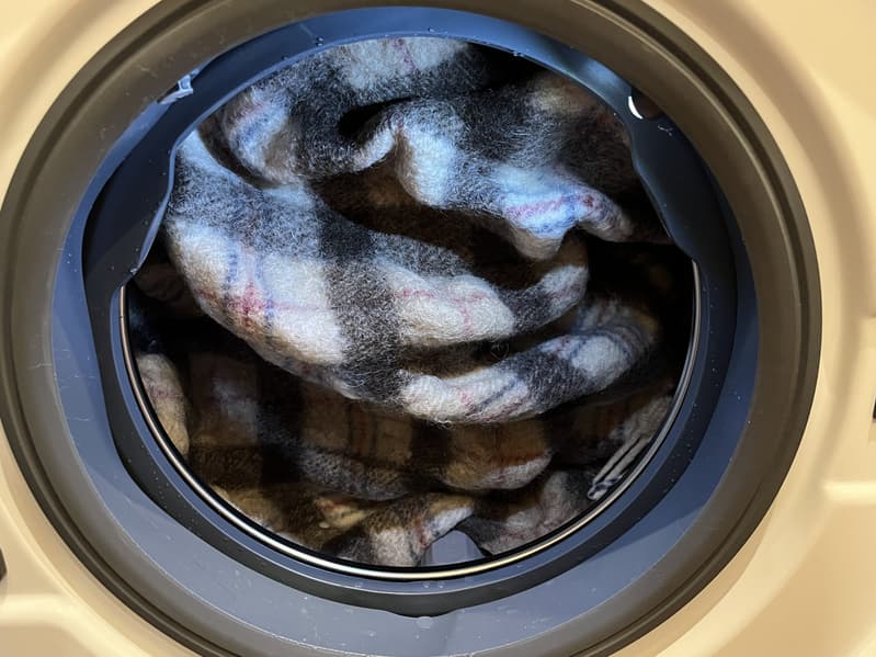 Как обычно, мы проверяем и способность машины бережно обходиться с деликатными тканями на примере, пожалуй, одной из самых капризных — шерсти. Для этого обязательного теста у нас есть плед, который хорошо бы отстирать без усадки, катышков, с сохранением мягкости и пушистости.