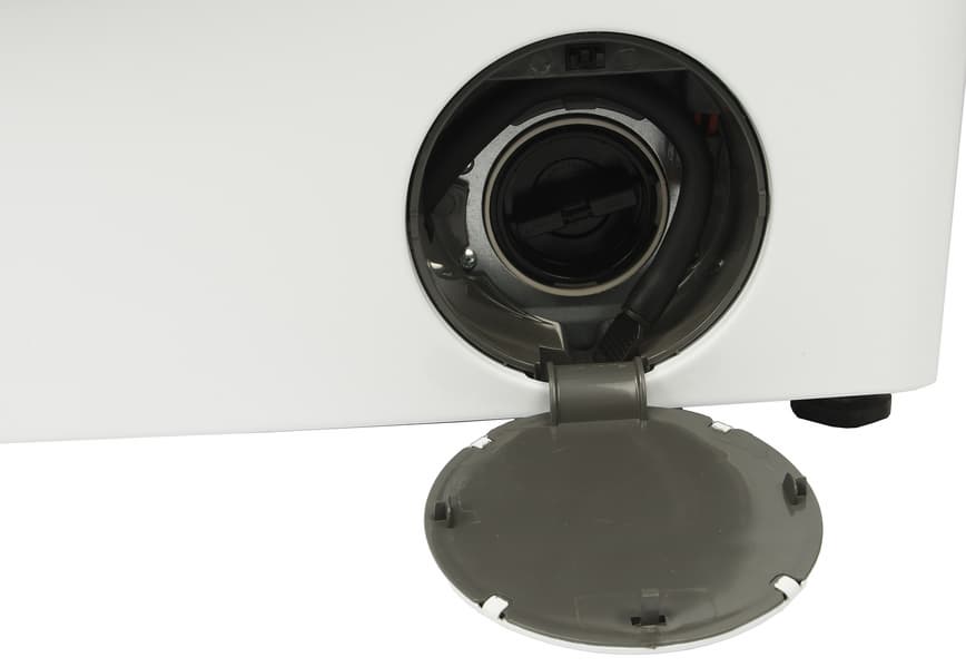 В правом нижнем углу передней панели расположена круглая крышка, под которой скрывается закручивающаяся крышка выпускного фильтра с дренажной трубкой. Лючок открывается без усилия и надежно фиксируется при закрывании.