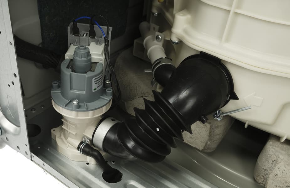 Выпускной шланг уже установлен на корпусе. Штуцер для заливного расположен в верхней правой части задней панели. В нем стоит несложный механический фильтр, предохраняющий устройство от загрязнений из магистрали ХВС.