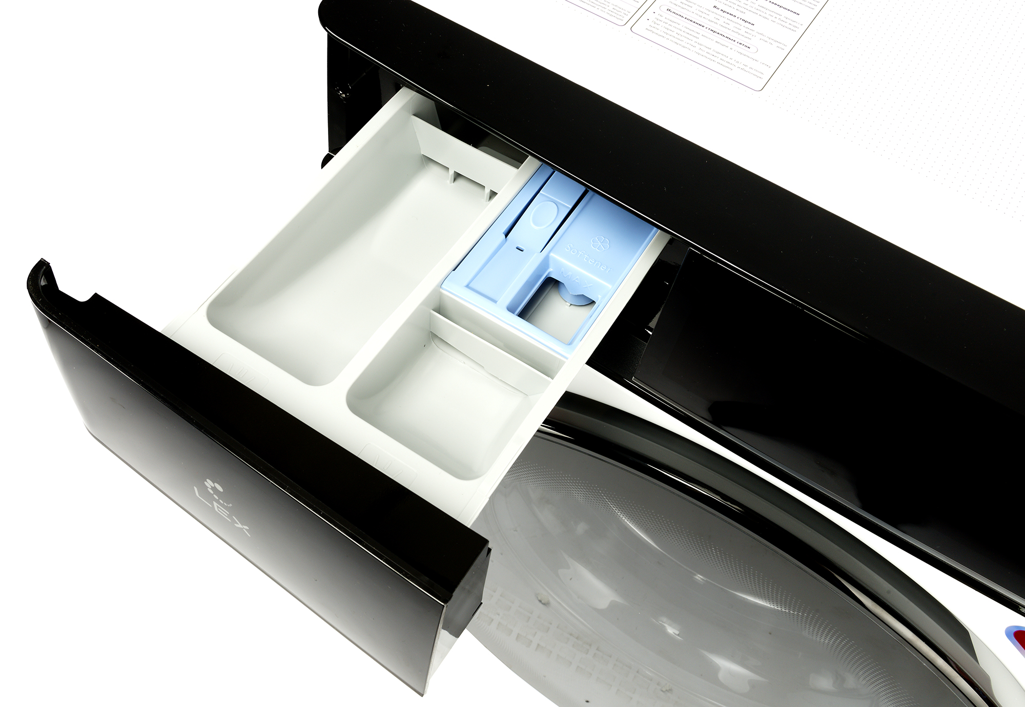 Модуль для моющих средств состоит из трех емкостей: крупный отсек слева — для порошка/моющего геля, поменьше — для порошка для предварительной стирки (средства, добавляемого в начале стирки, при наличии сильных загрязнений), а ближе к корпусу — отсек с голубой крышкой для кондиционера.